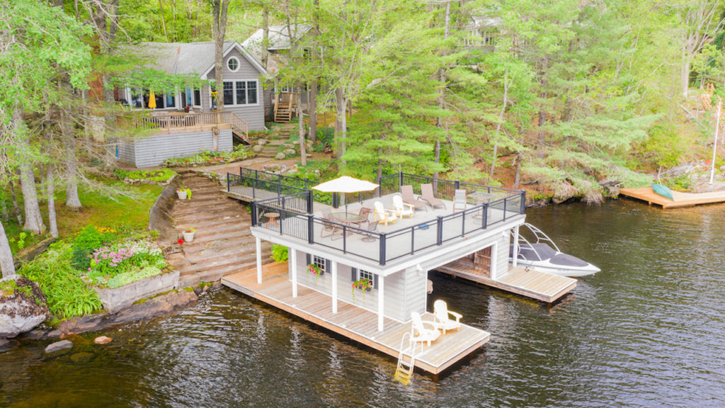 On top of the boathouse is this stellar patio. The glass barriers ensure there is nothing that blocks the view of Lake Muskoka.