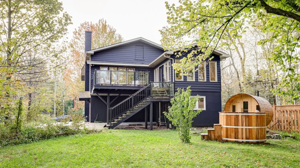 In addition to four bedrooms and three bathrooms, the home features an outdoor sauna and hot tub. There’s also plenty of space to enjoy the good weather days on the large deck and grassy backyard. It spans two storeys of living space and is currently listed for $1.699 million.