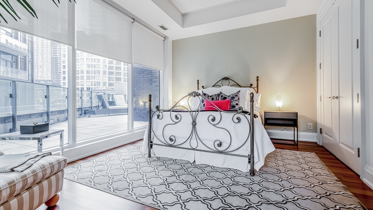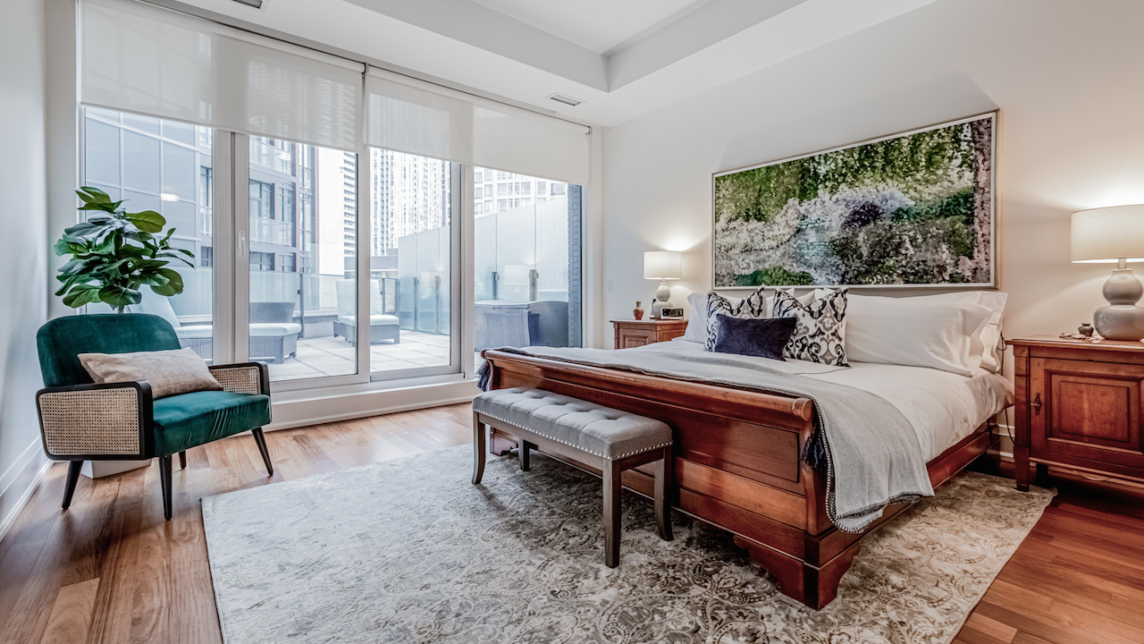 The second bedroom is equally worthy of the primary suite title. A full wall of windows looks out to the terrace.