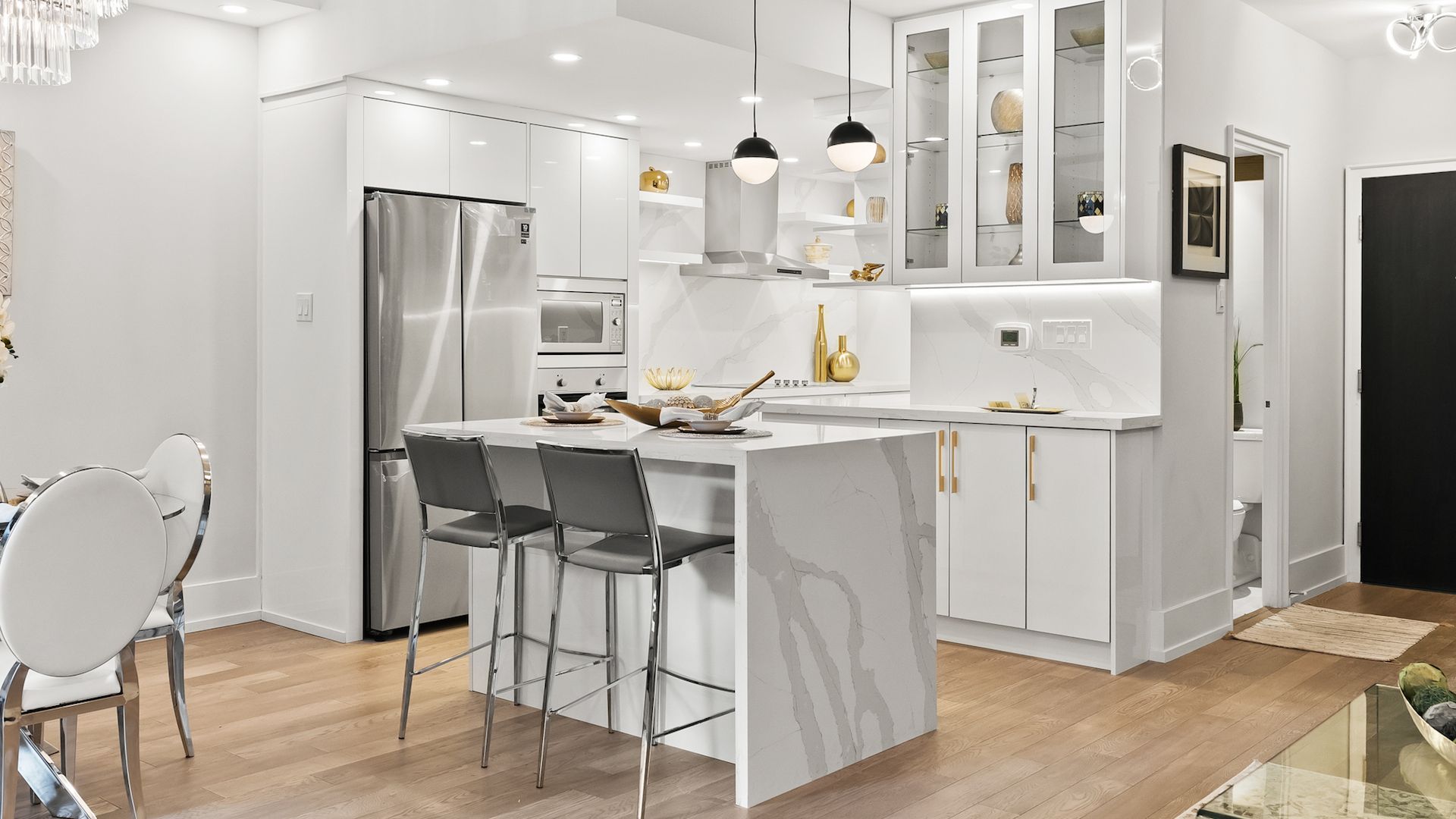 Gold finishes pop in the all-white kitchen. This modern cooking space comes with stainless-steel appliances and marble waterfall island that can be used as a breakfast bar.