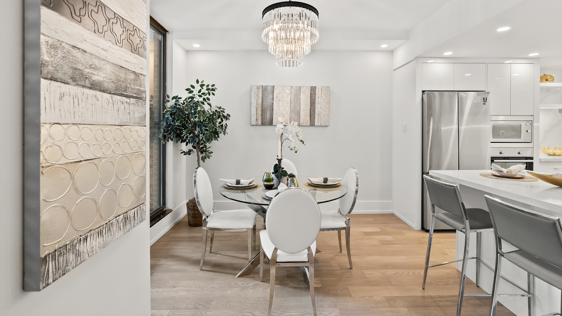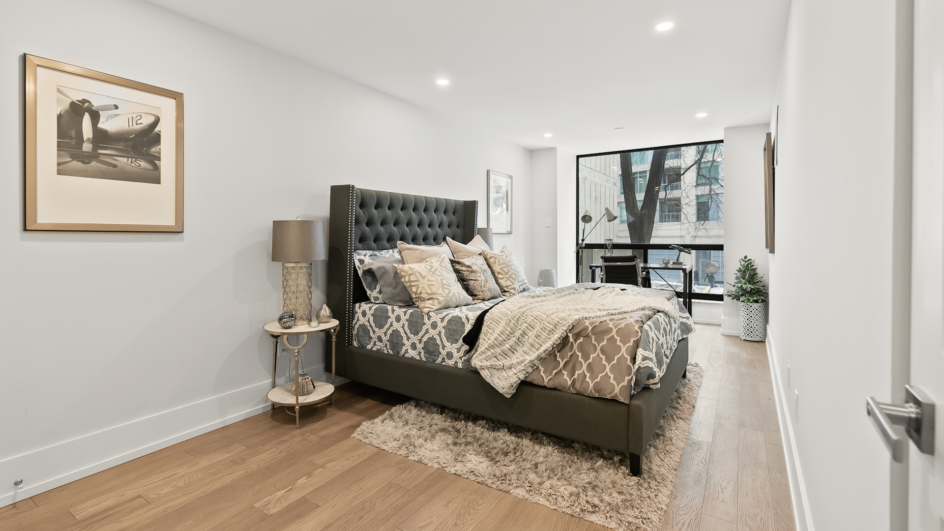 Light hardwood floors and pot lighting brightens up the condo.