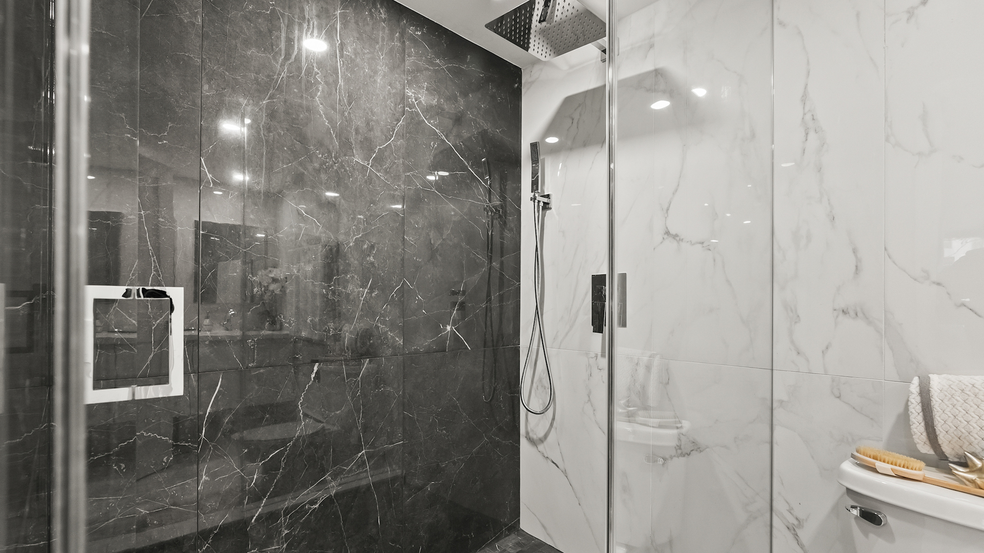 This luxe bathroom is the epitome of modern luxury. It’s decked in marble from floor to ceiling and comes with a floating vanity.