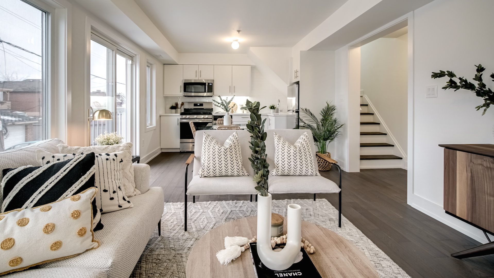 The open concept floor plan combines the living room, dining area and kitchen. Large windows border the room and allow natural light to shine through.
