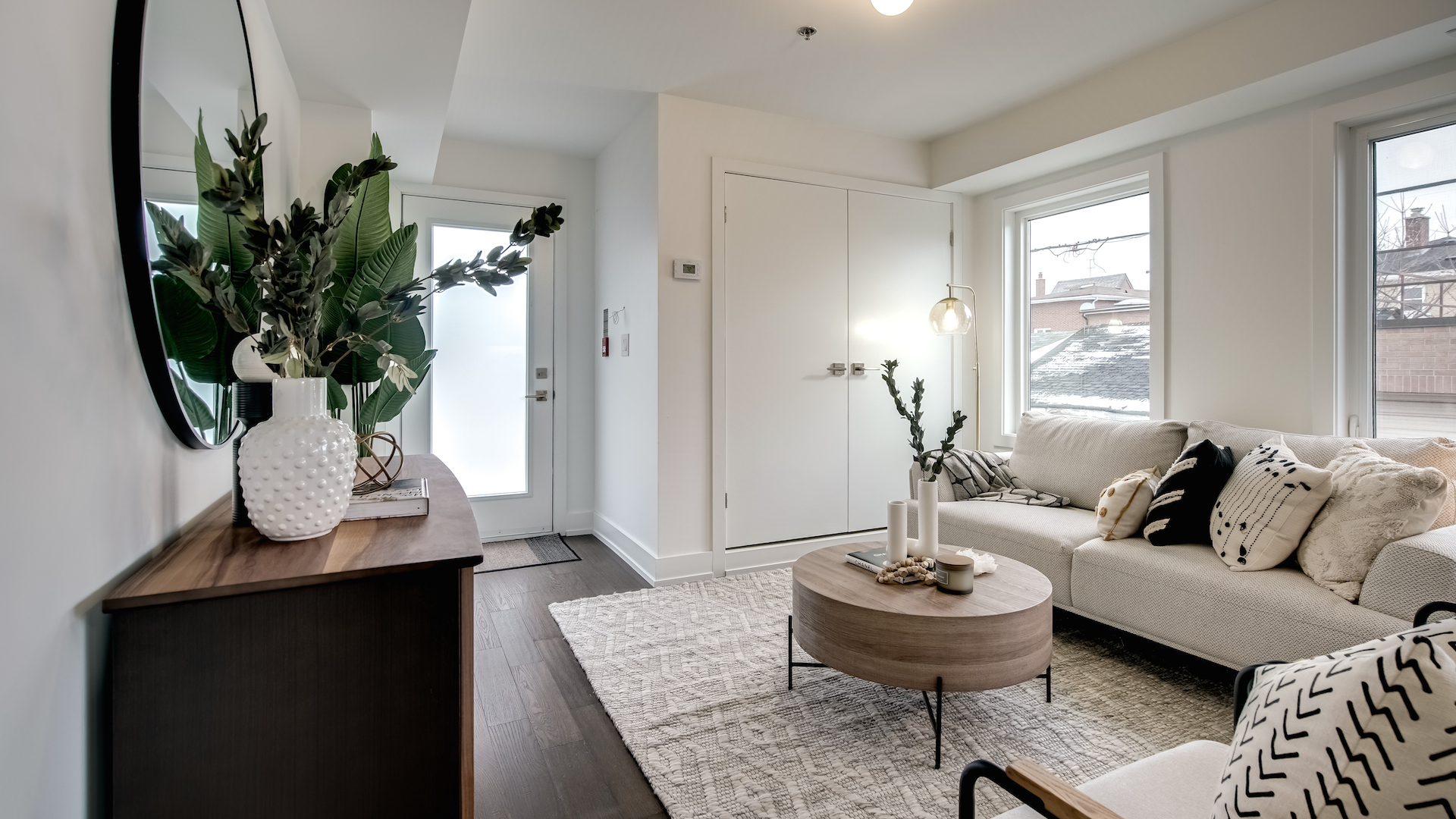 Dark hardwood floors nicely contrast the white walls as you step into the entryway.