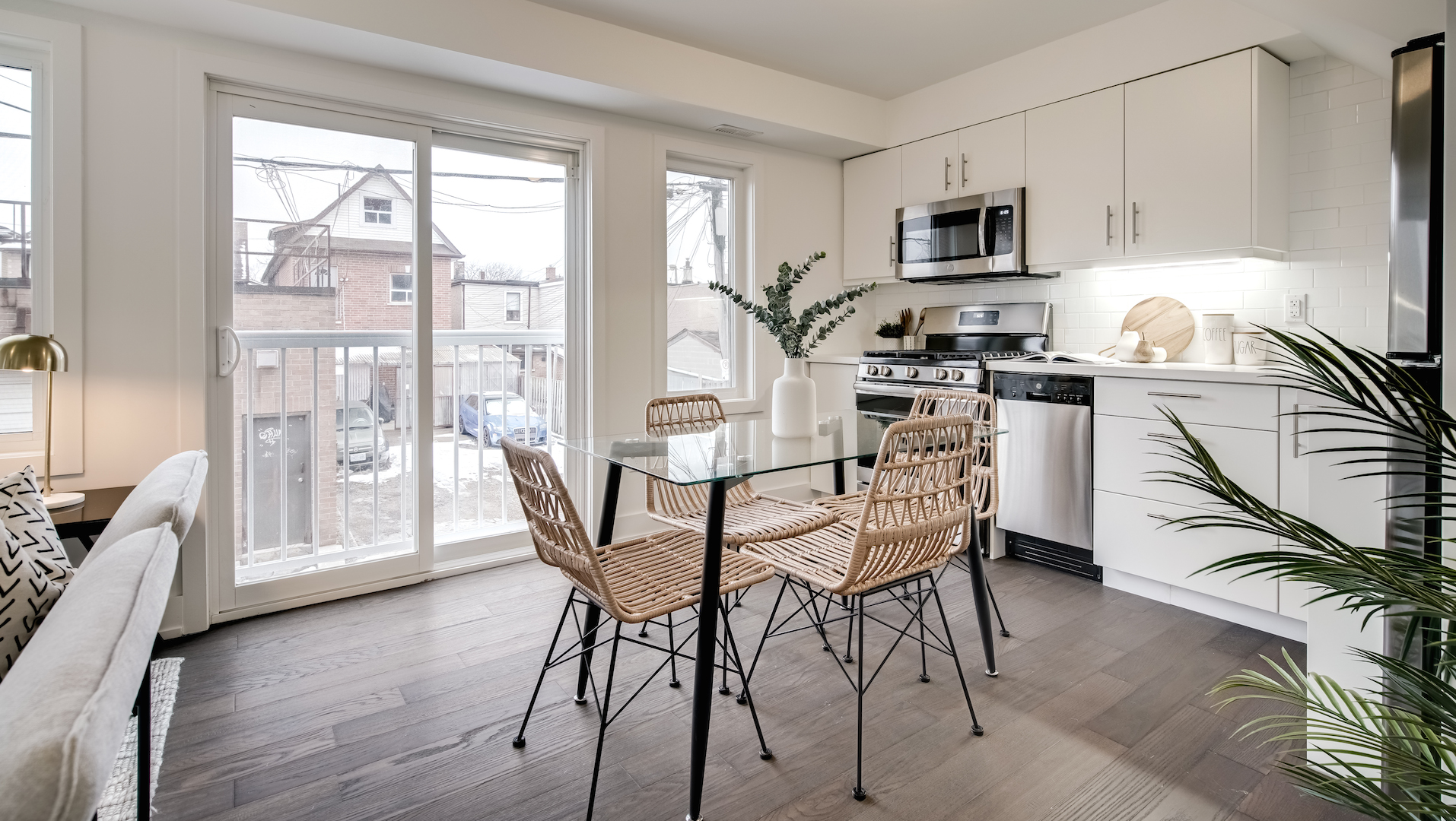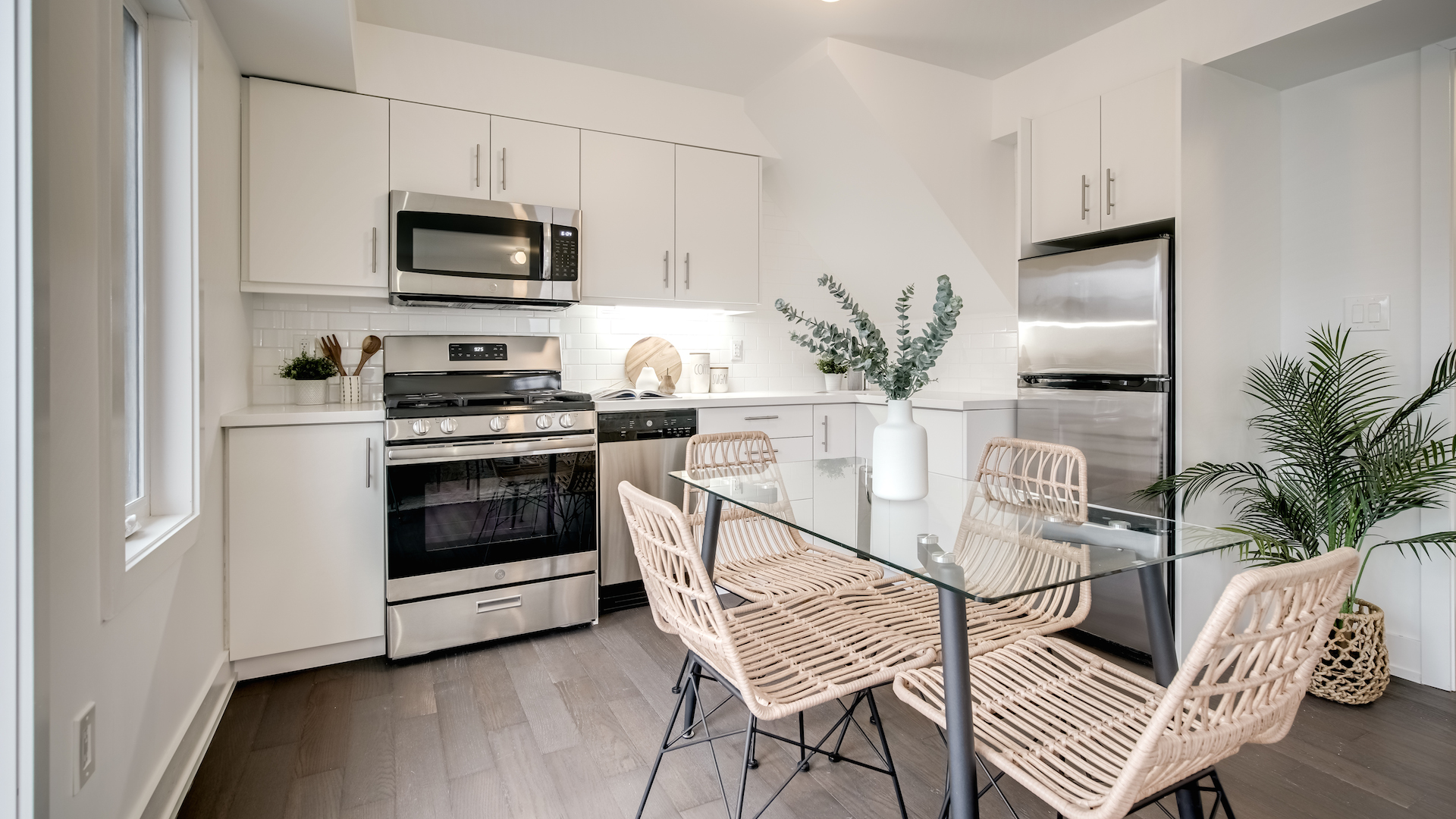 Stainless steel appliances are tucked within the kitchen’s cabinetry. The modern can easily accommodate a four-person dining set.