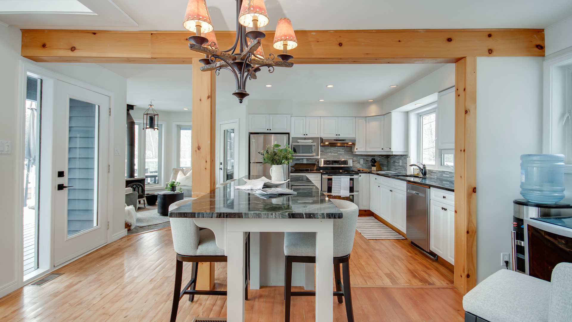 Wooden beams separate the kitchen from the living room. The island provides extra counterspace and doubles as a breakfast bar.
