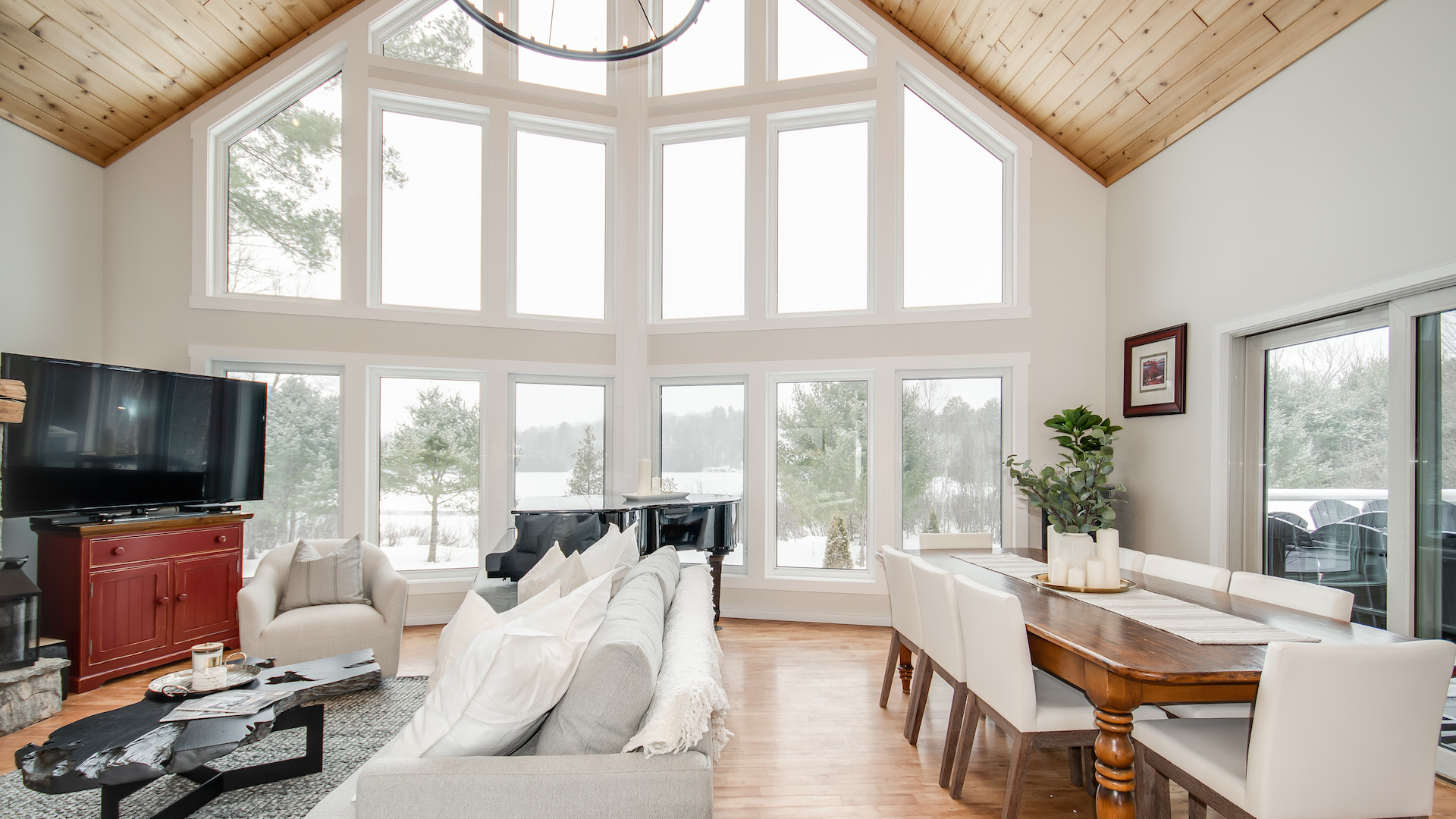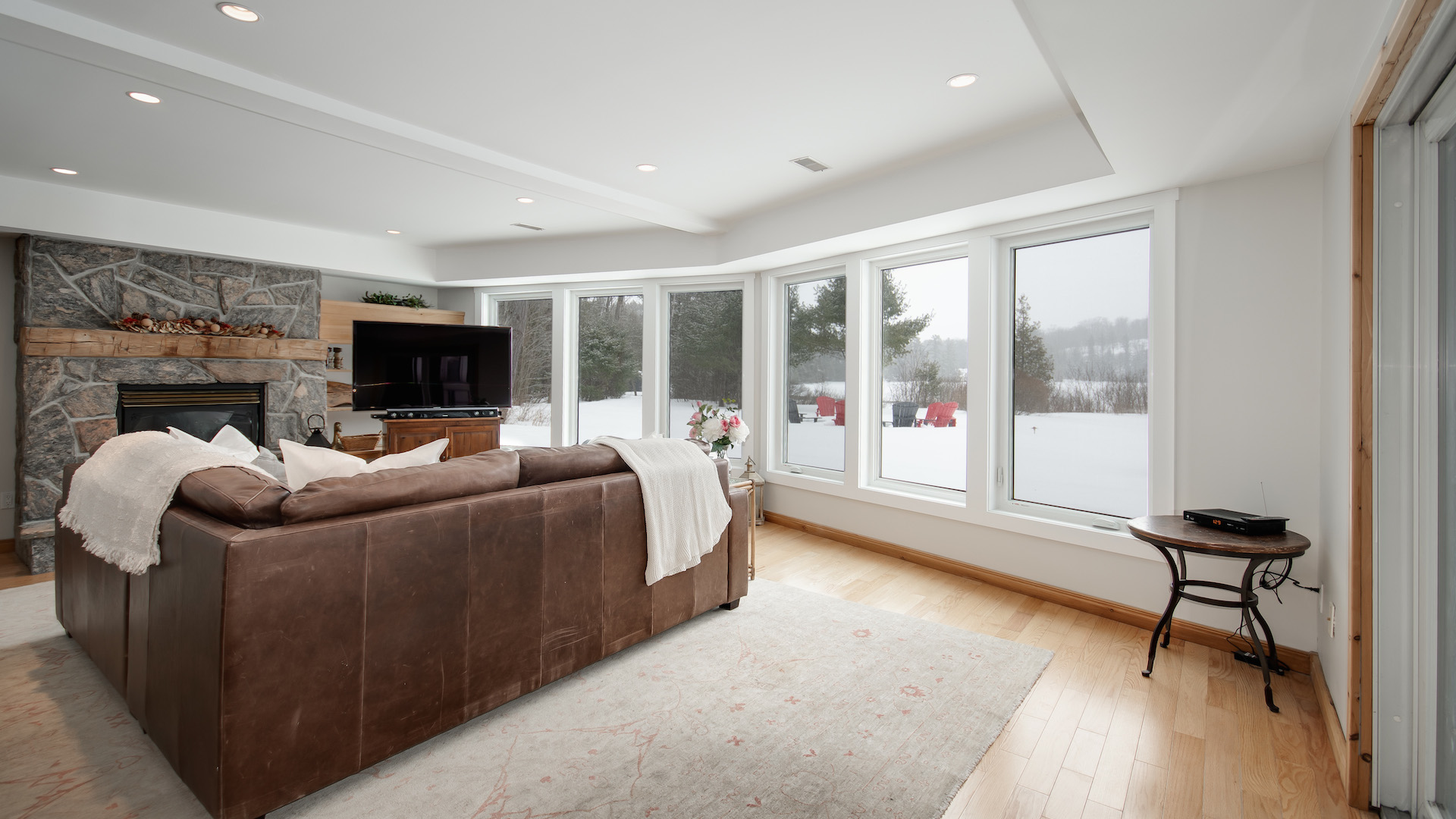 There’s additional living space in the lower level. The wall-to-wall windows ensure you can enjoy views of the outdoors wherever you’re sitting.