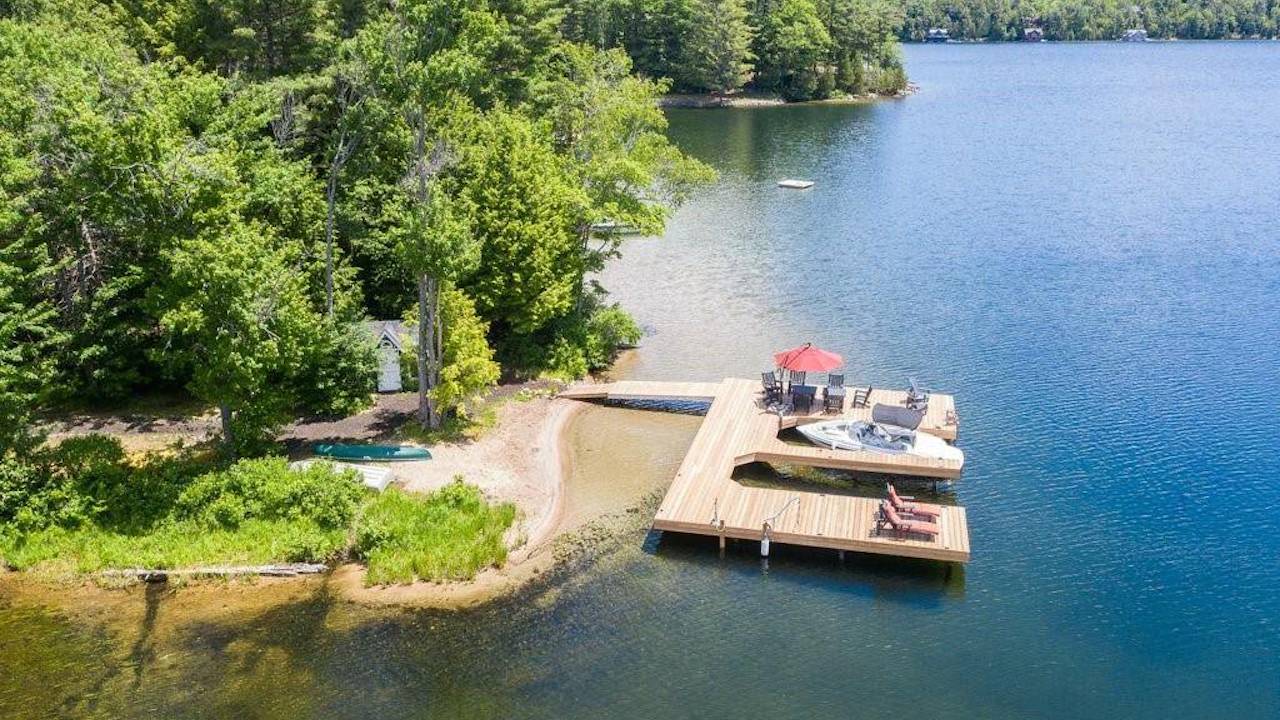 The cottage at 1 Mets Rd. has everything you could want and more in a summer home. For starters, it’s designed with a commanding Muskoka A-frame exterior and comes with 470 feet of private waterfront. The property also comes with a whopping 2.6 acres of yard space and loads of privacy.
