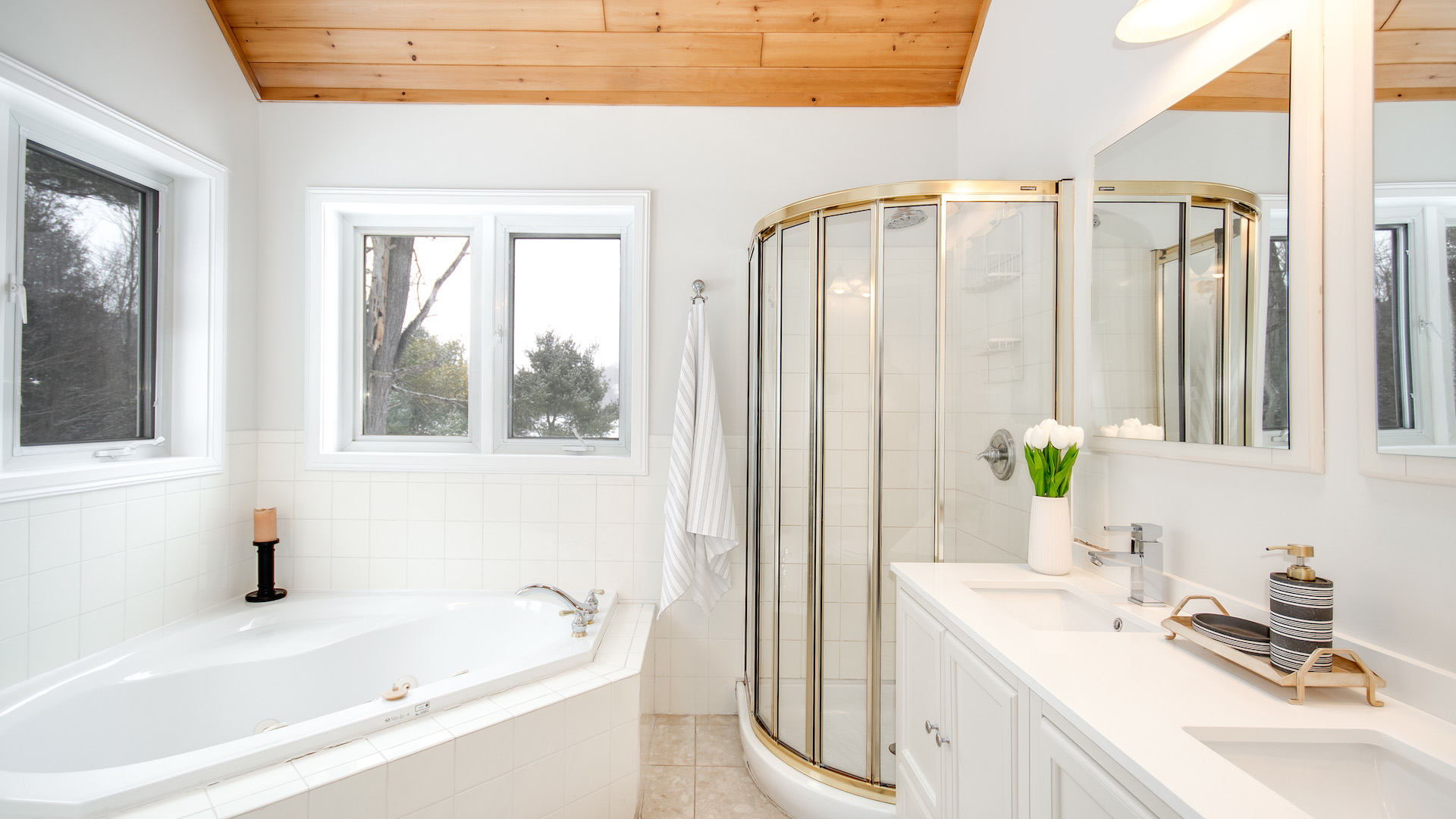 Wooden ceilings pop in this bathroom, which includes a bathtub and double sinks.