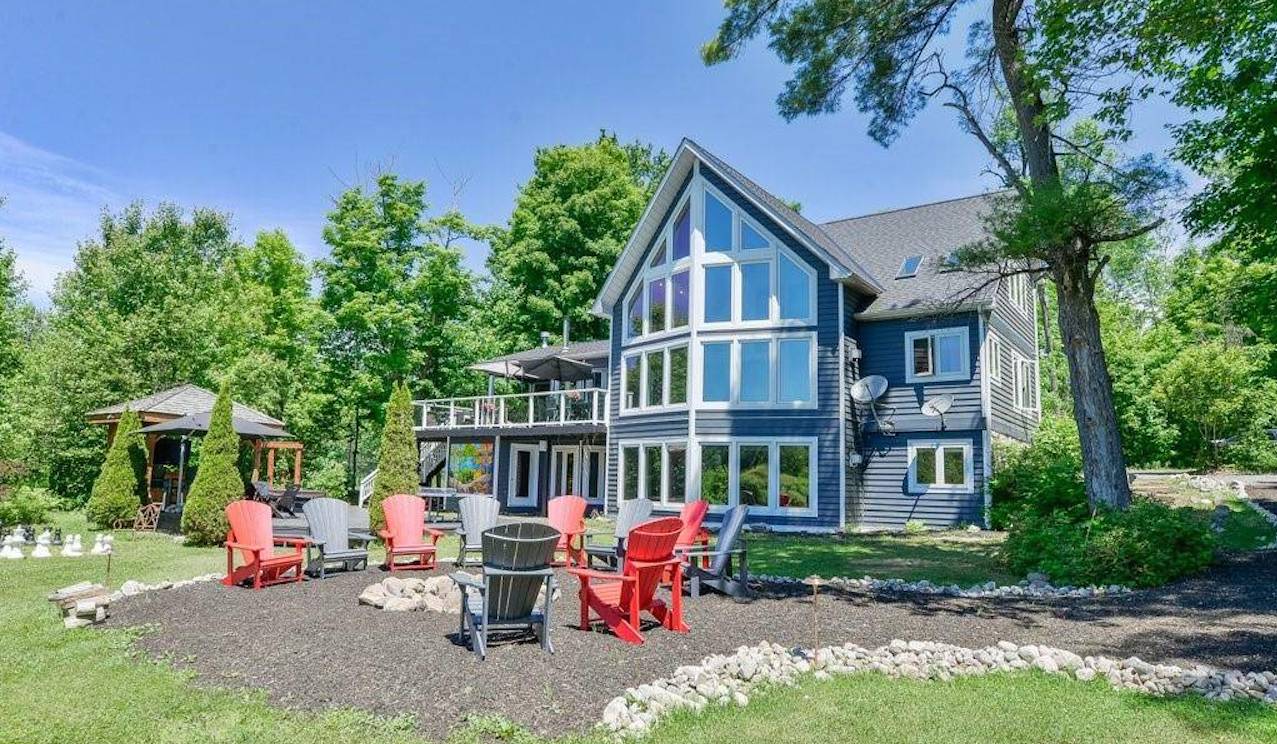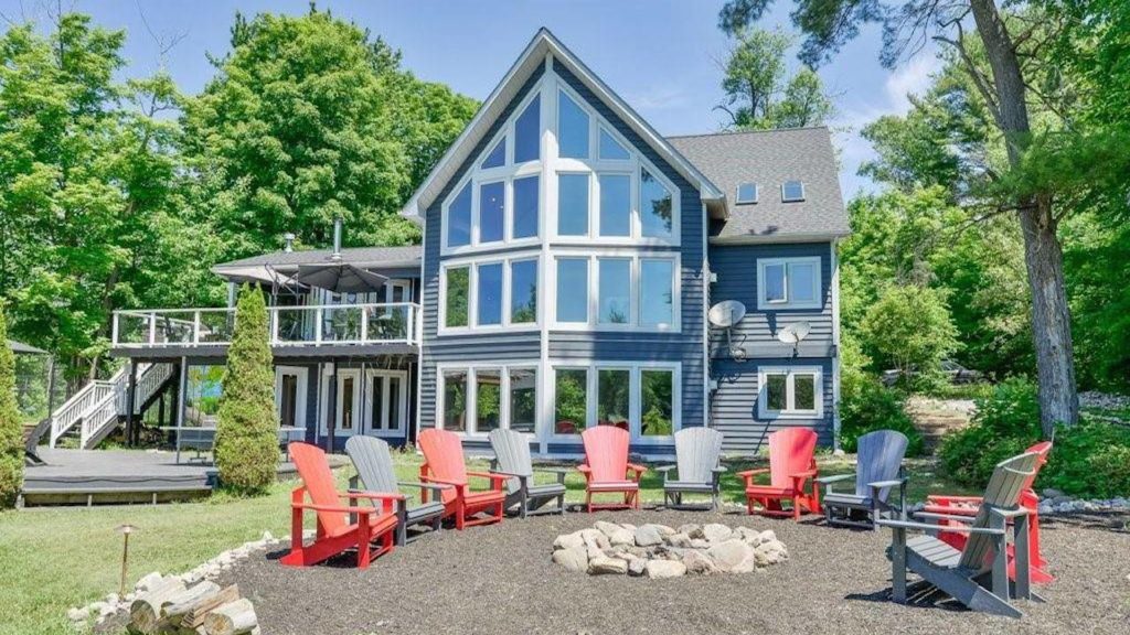 As great as the inside is, the best part of this cottage is definitely the outdoor space. There’s an upper deck with a staircase leading down to the yard. Check out the massive firepit area that can fit at least 10 Muskoka chairs around it.