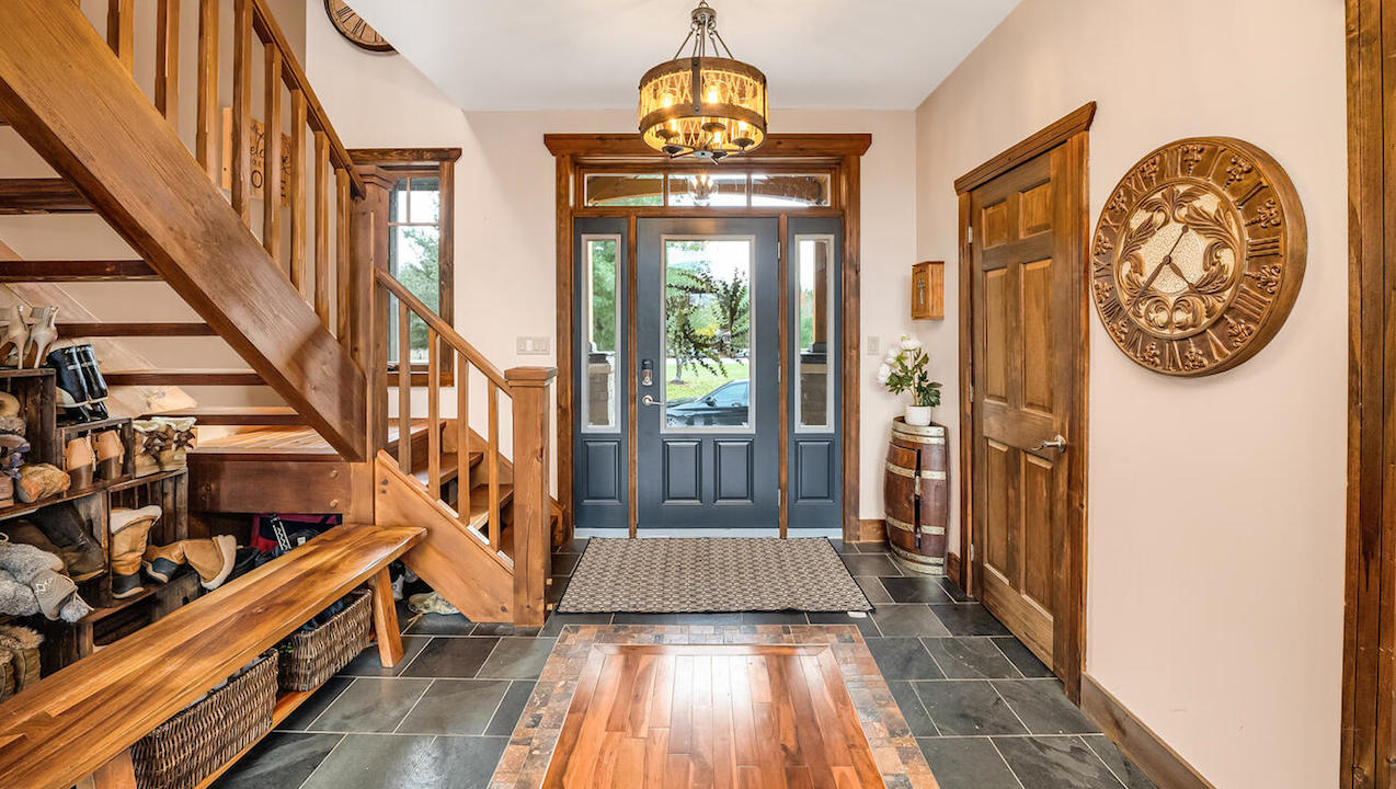 Here’s the front hall. Notice the perfectly rustic hardwood details, the stylish floor and the fine quality of the staircase. Just look at that impressive front door flanked with sidelight windows. Stunning!