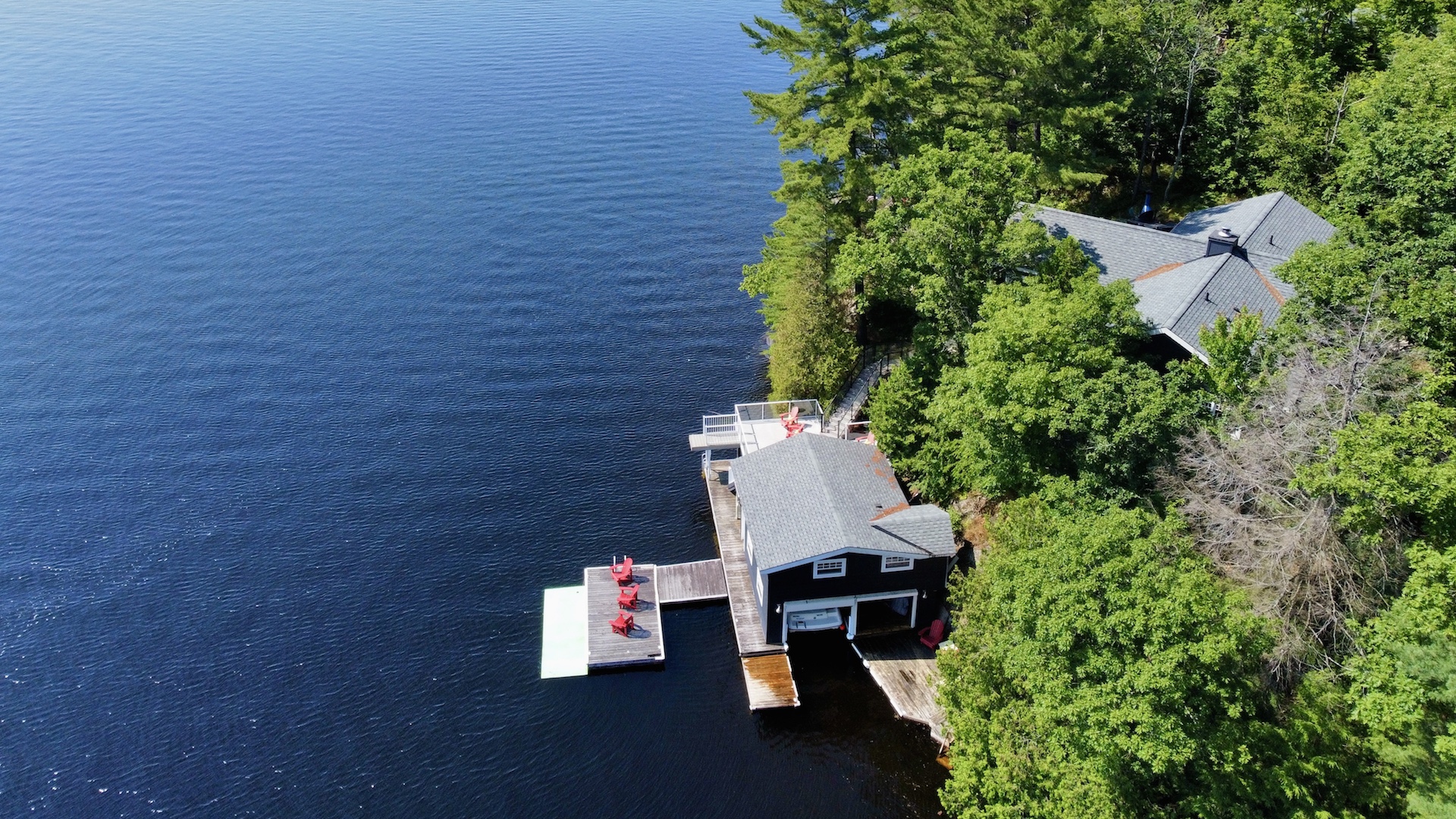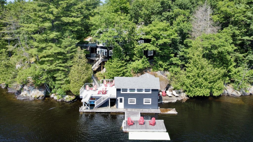 At the tip of a small peninsula on Lake Muskoka, surrounded by the dramatic landscape of the northern backcountry, you’ll come upon a cottage that marries classic Muskoka design with a hint of Cape Cod. Listed at $3.299 million, this beautiful property at 2045 Muskoka Rd. 118W / Wyldewood Rd. Unit 30 features four bedrooms, three bathrooms and a series of tiered patios that guide you to a picturesque boathouse at the water’s edge with a one-bedroom apartment on top.