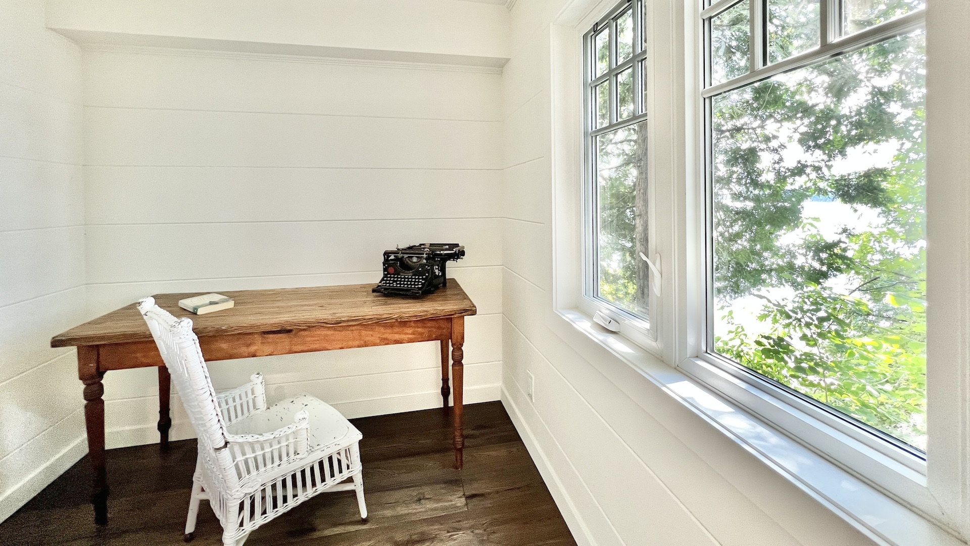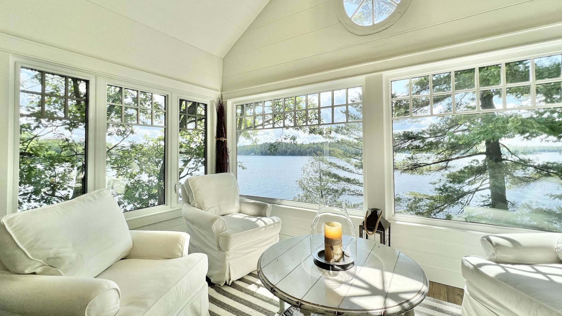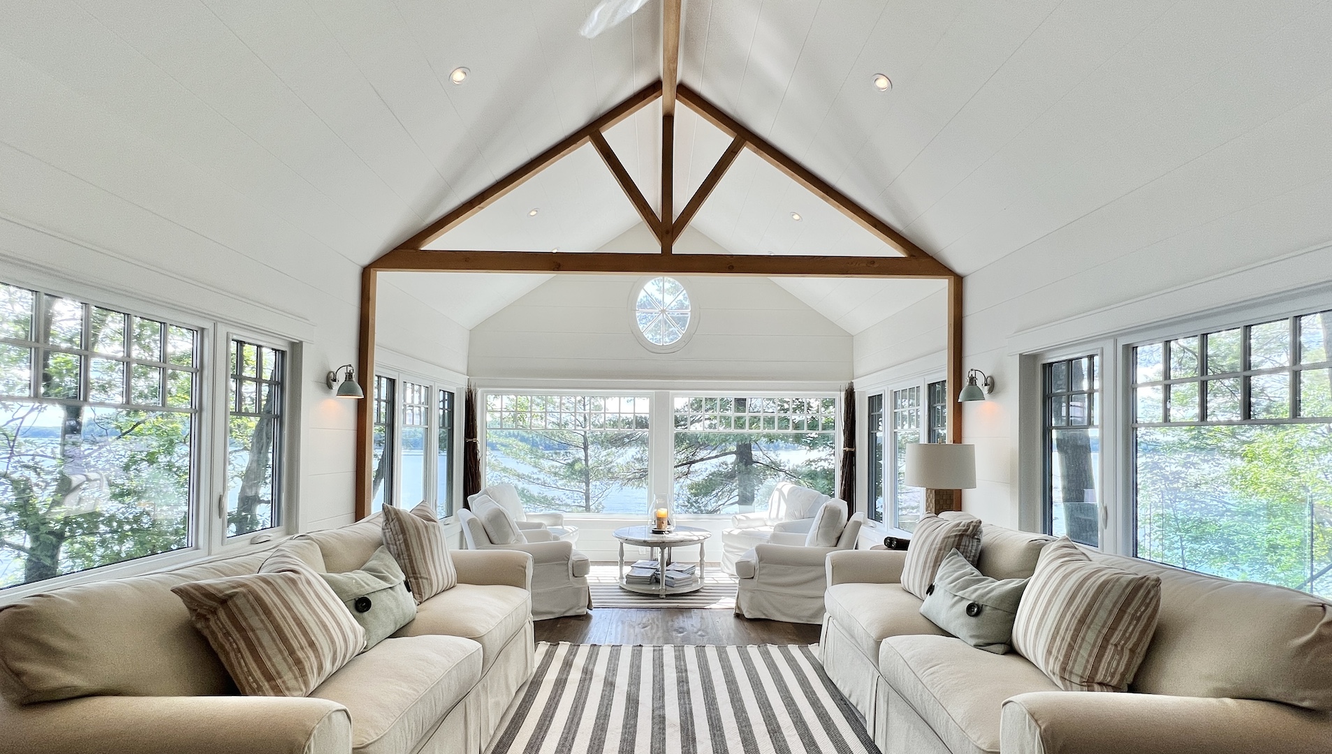 The whitewashed interior, with its rustic charm and dazzling window views, offers a nostalgic New England lake house ambiance.