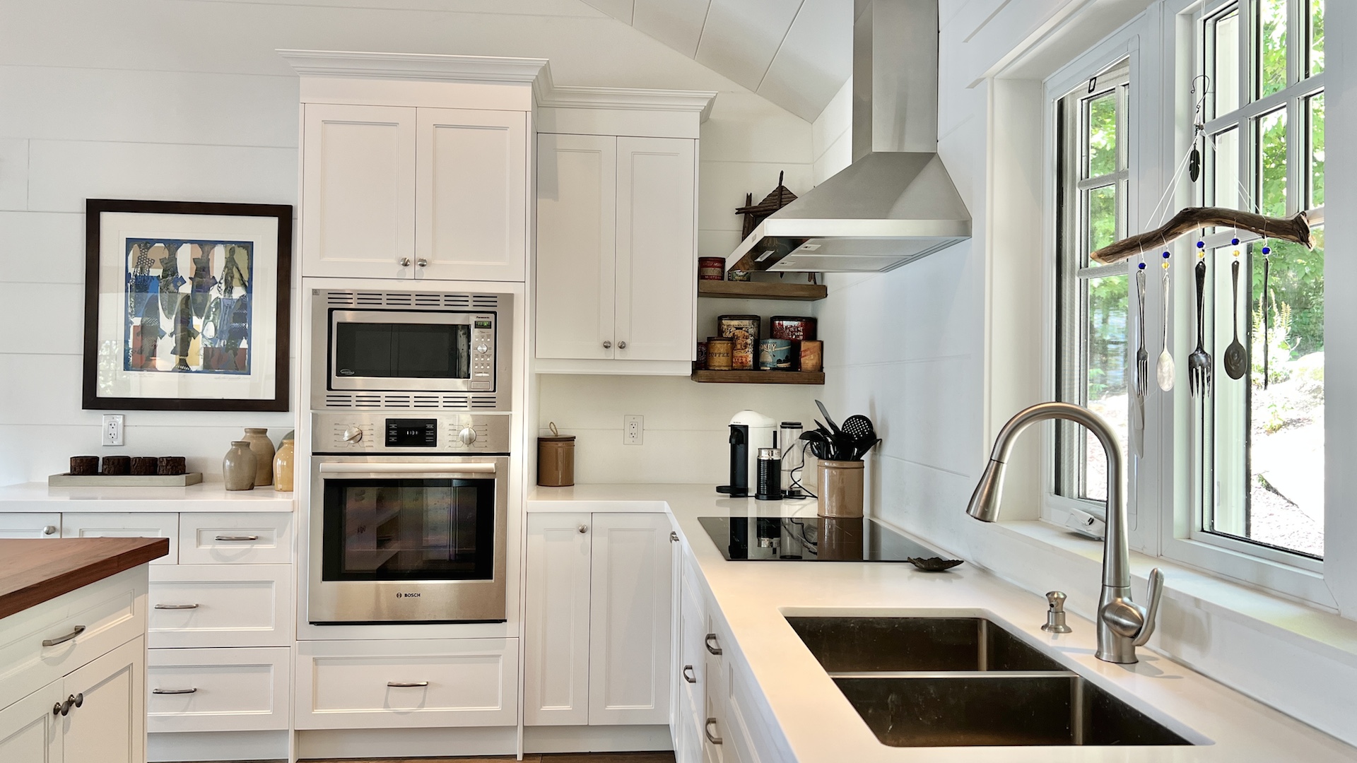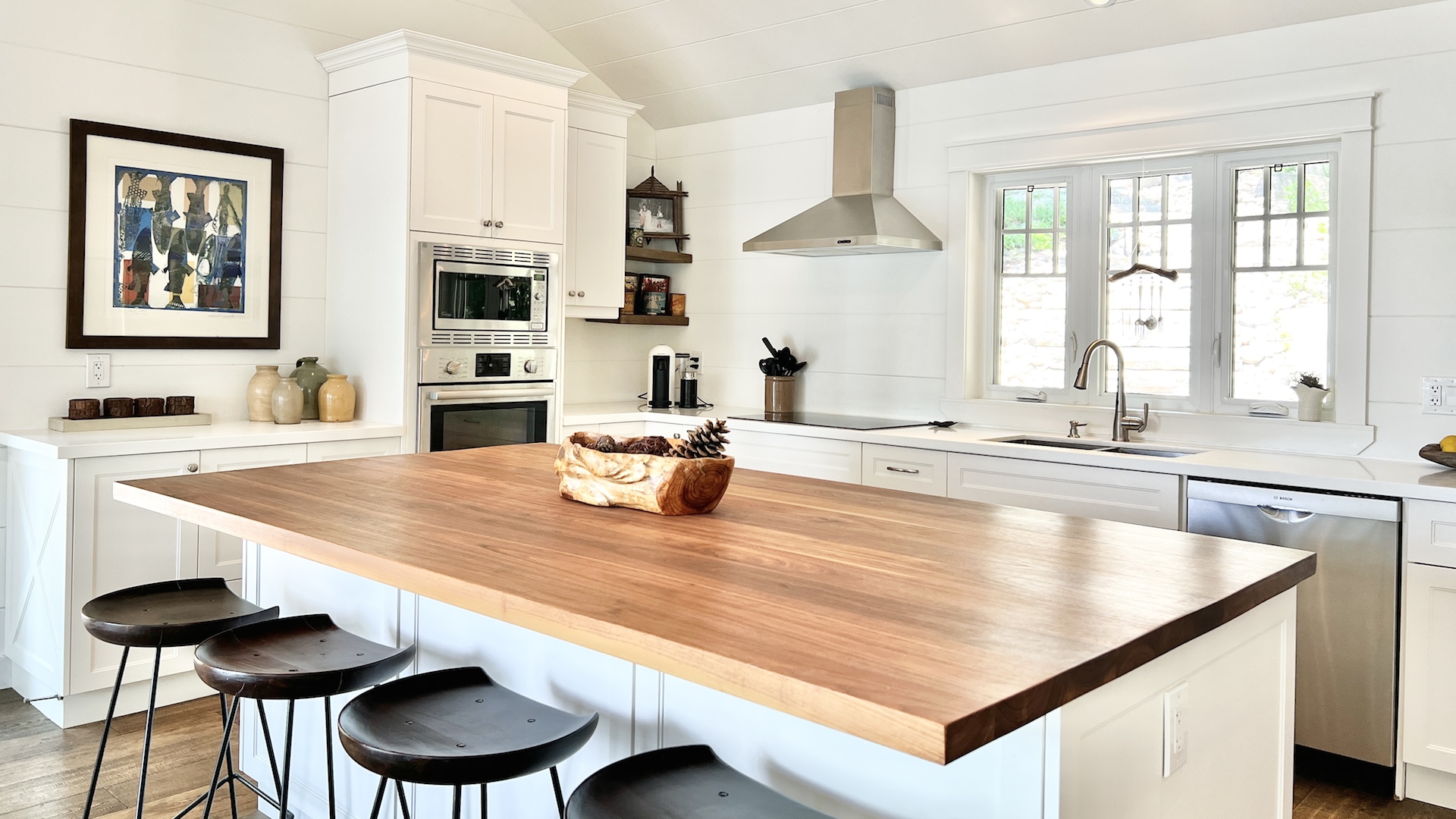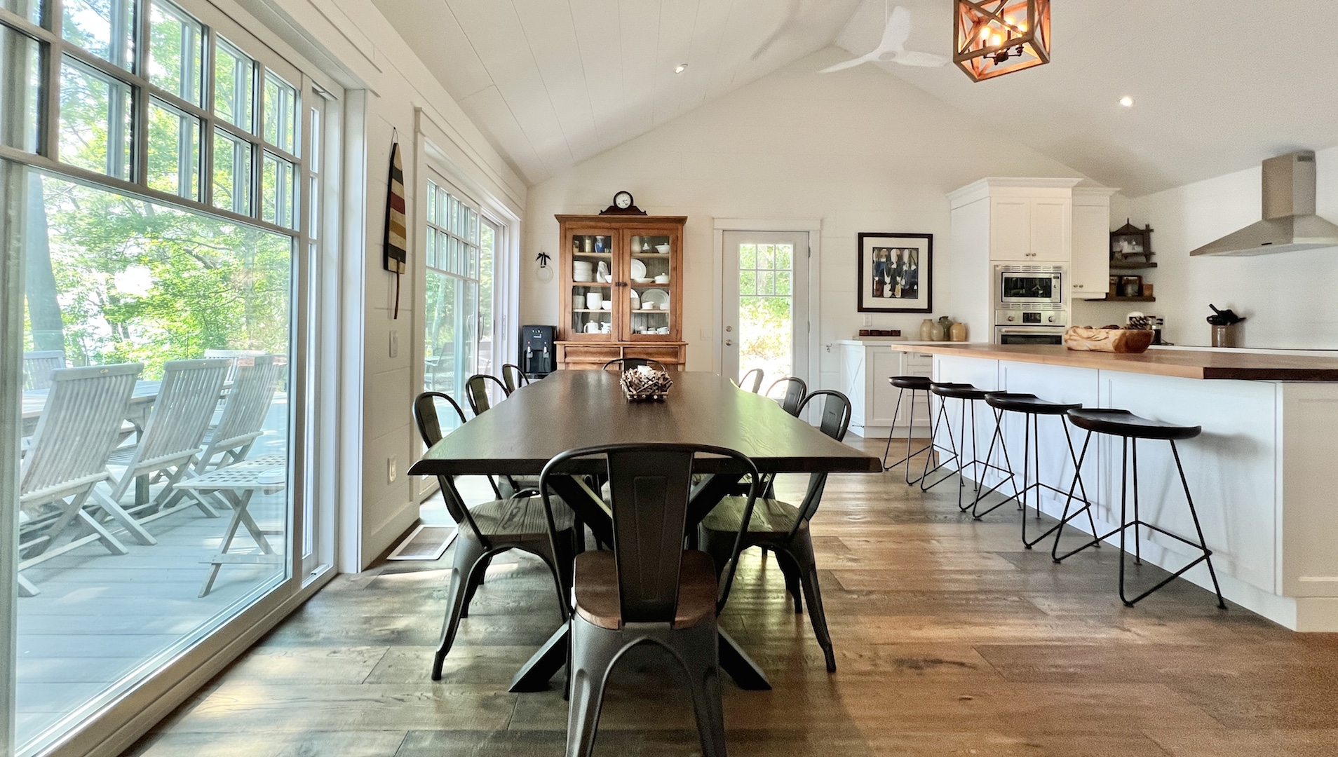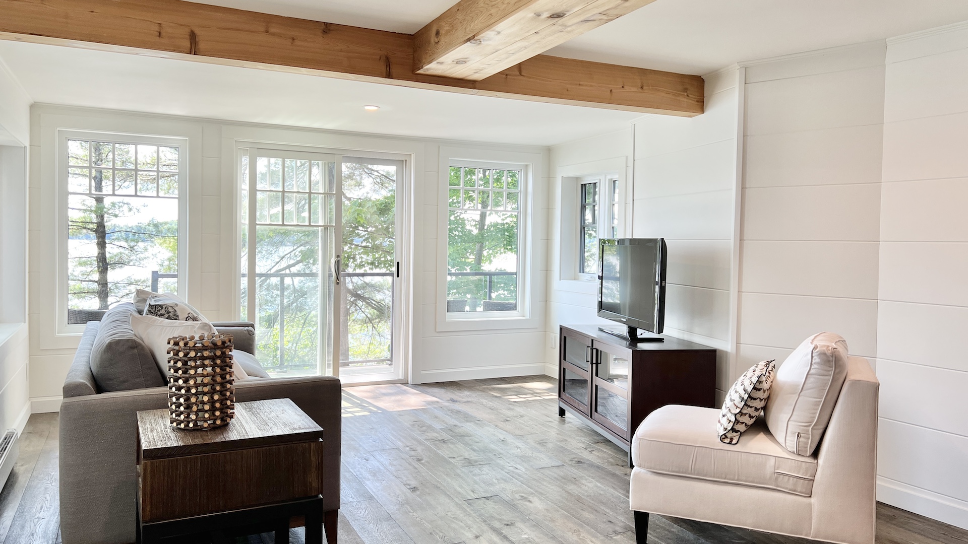 The whitewashed interior, with its rustic charm and dazzling window views, offers a nostalgic New England lake house ambiance.