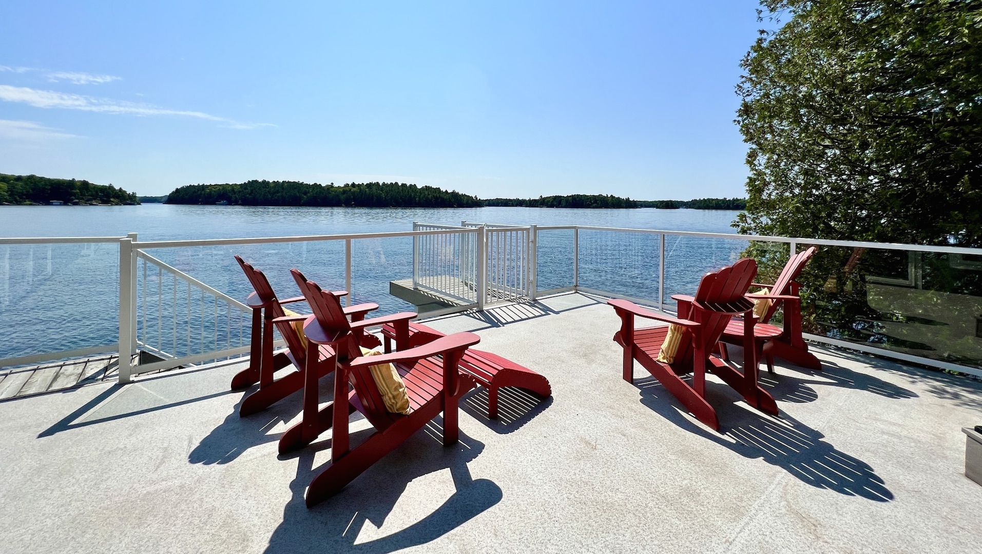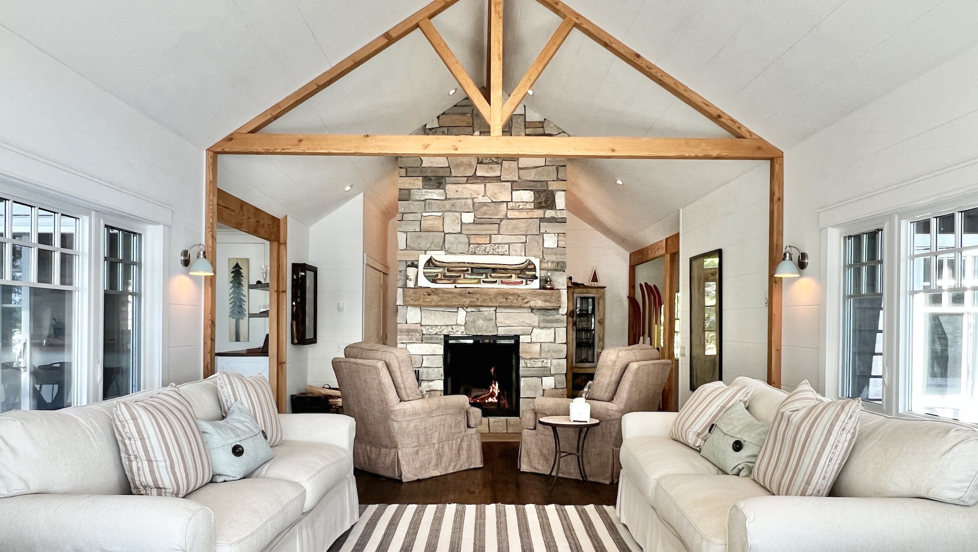 The sun-drenched living room, which features a vaulted ceiling with exposed beams, a stone fireplace and wraparound views of the lake, is a cheerful space.