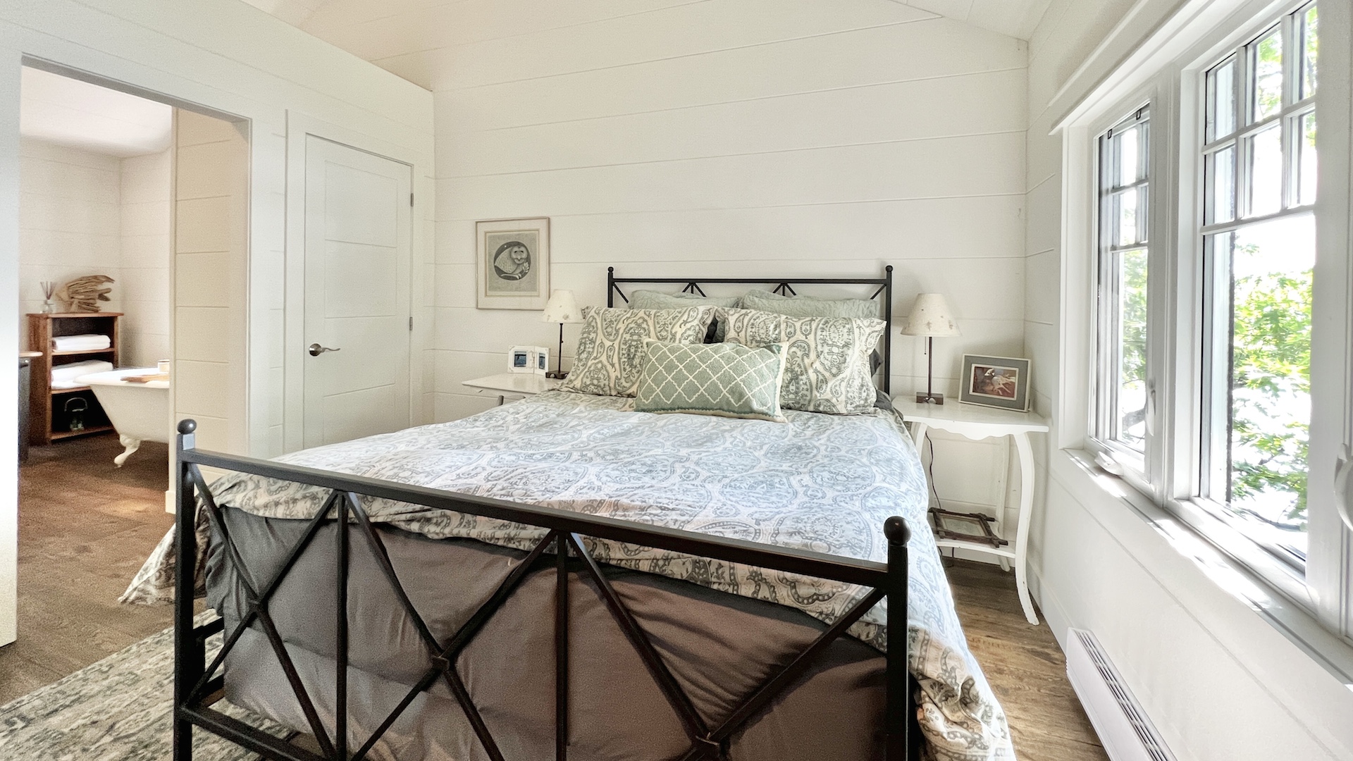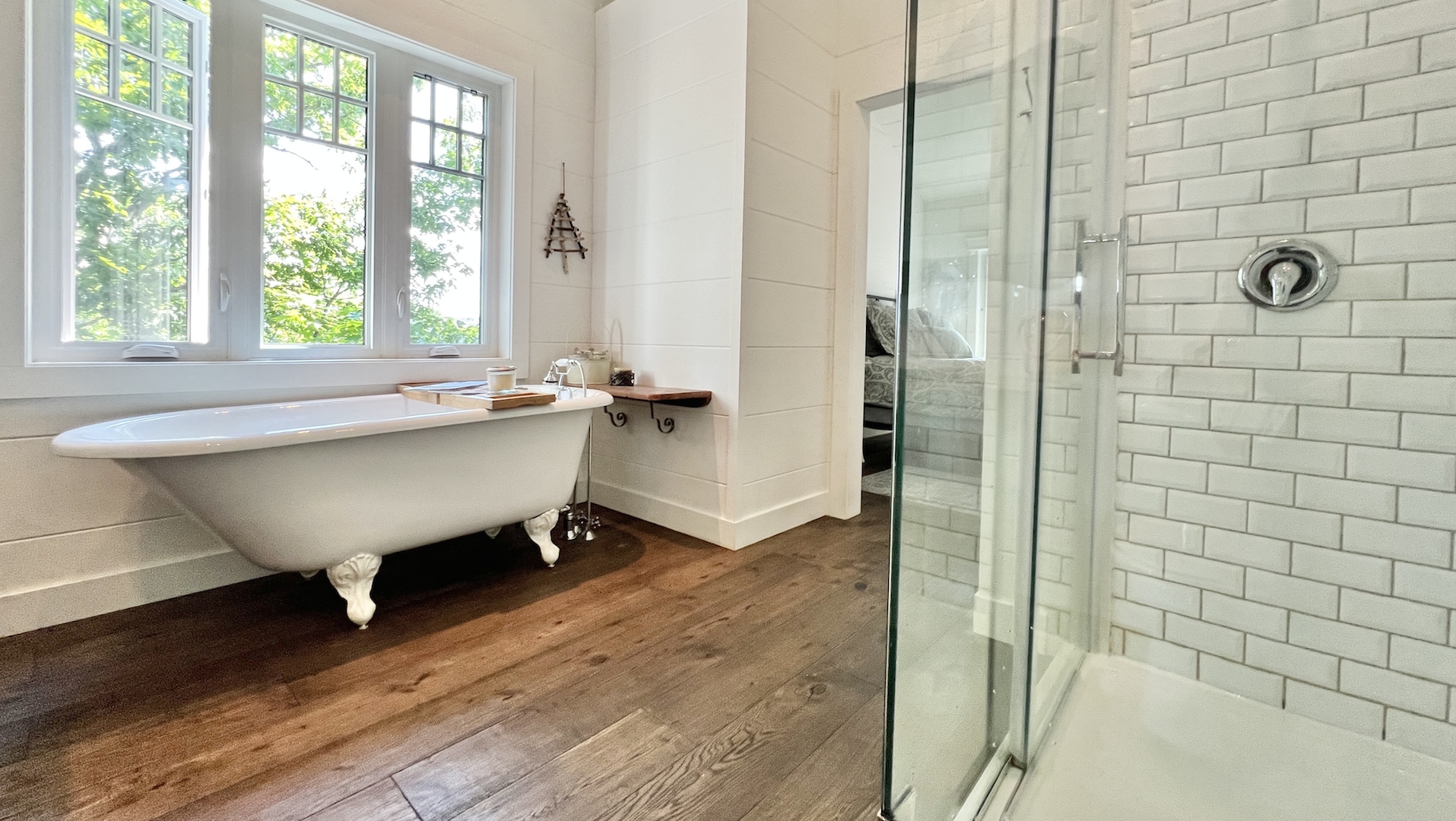 The ensuite bathroom, as seen here, features an antique-style clawfoot tub and a modern walk-in shower.