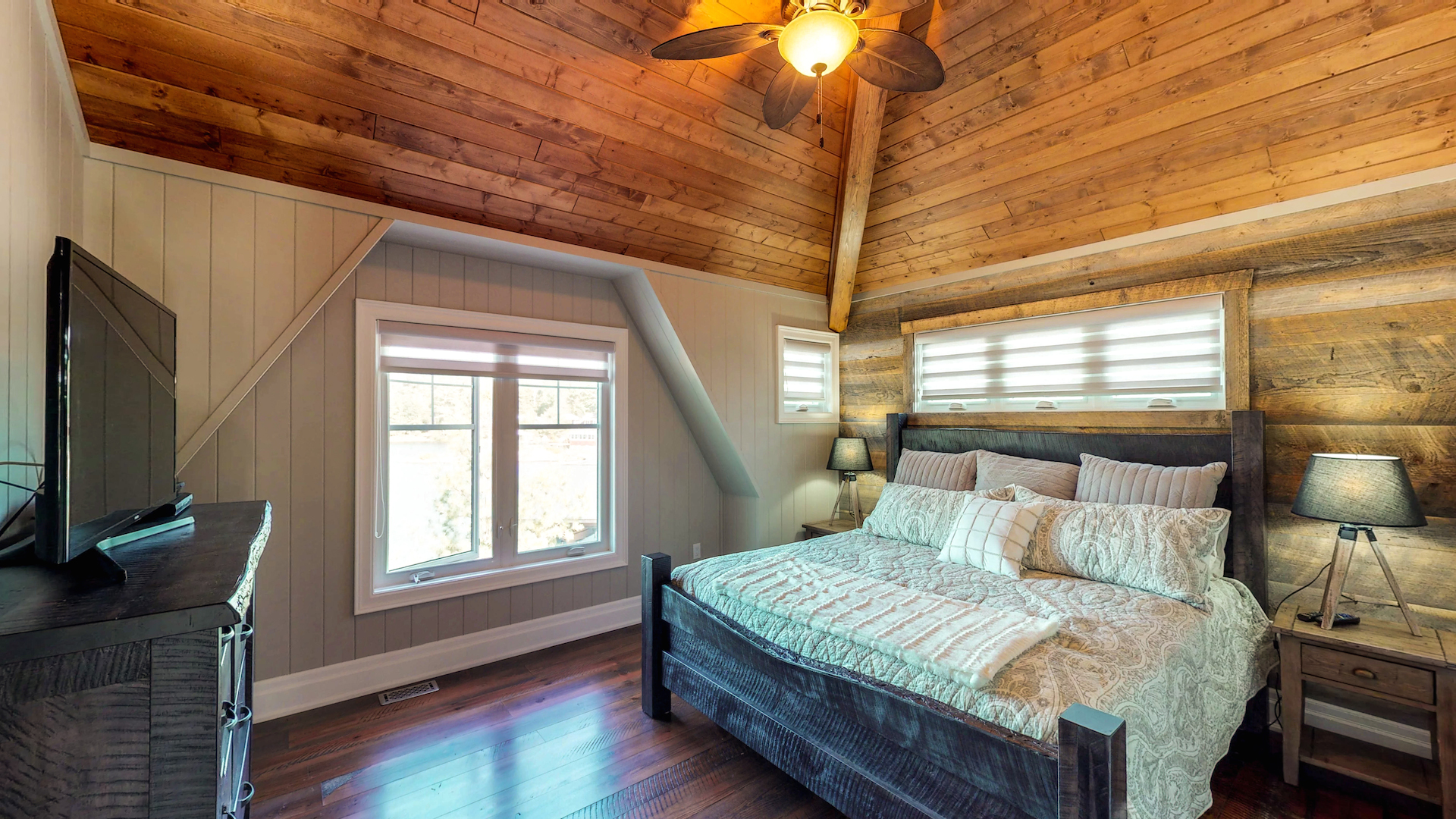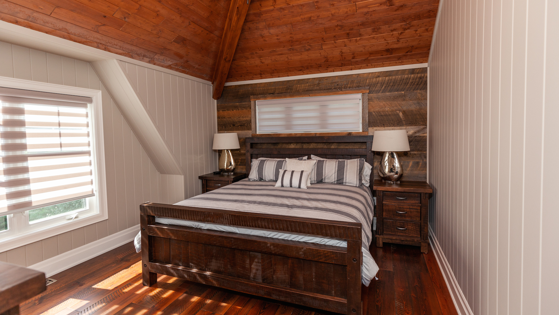 Wooden ceilings bring a cosy cabin feel to each of the bedrooms.