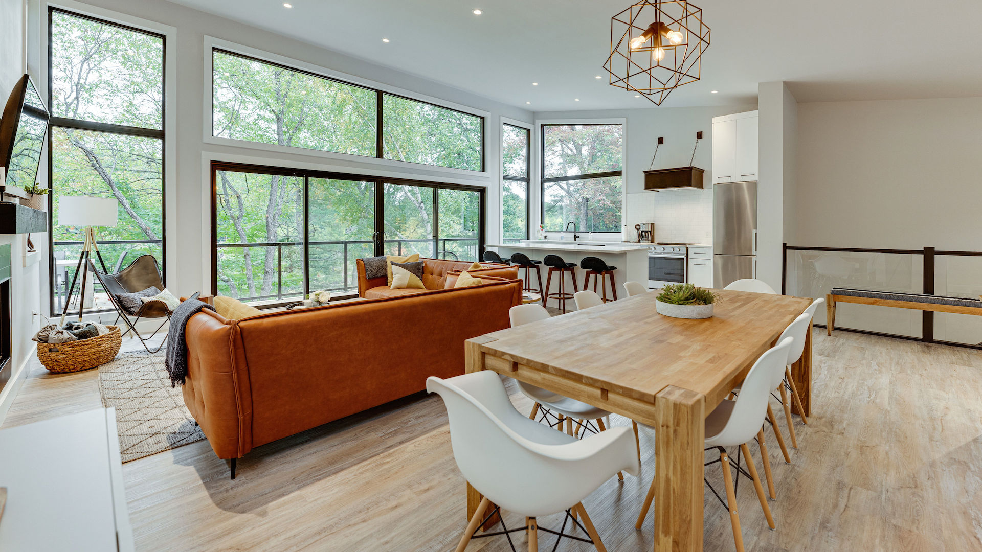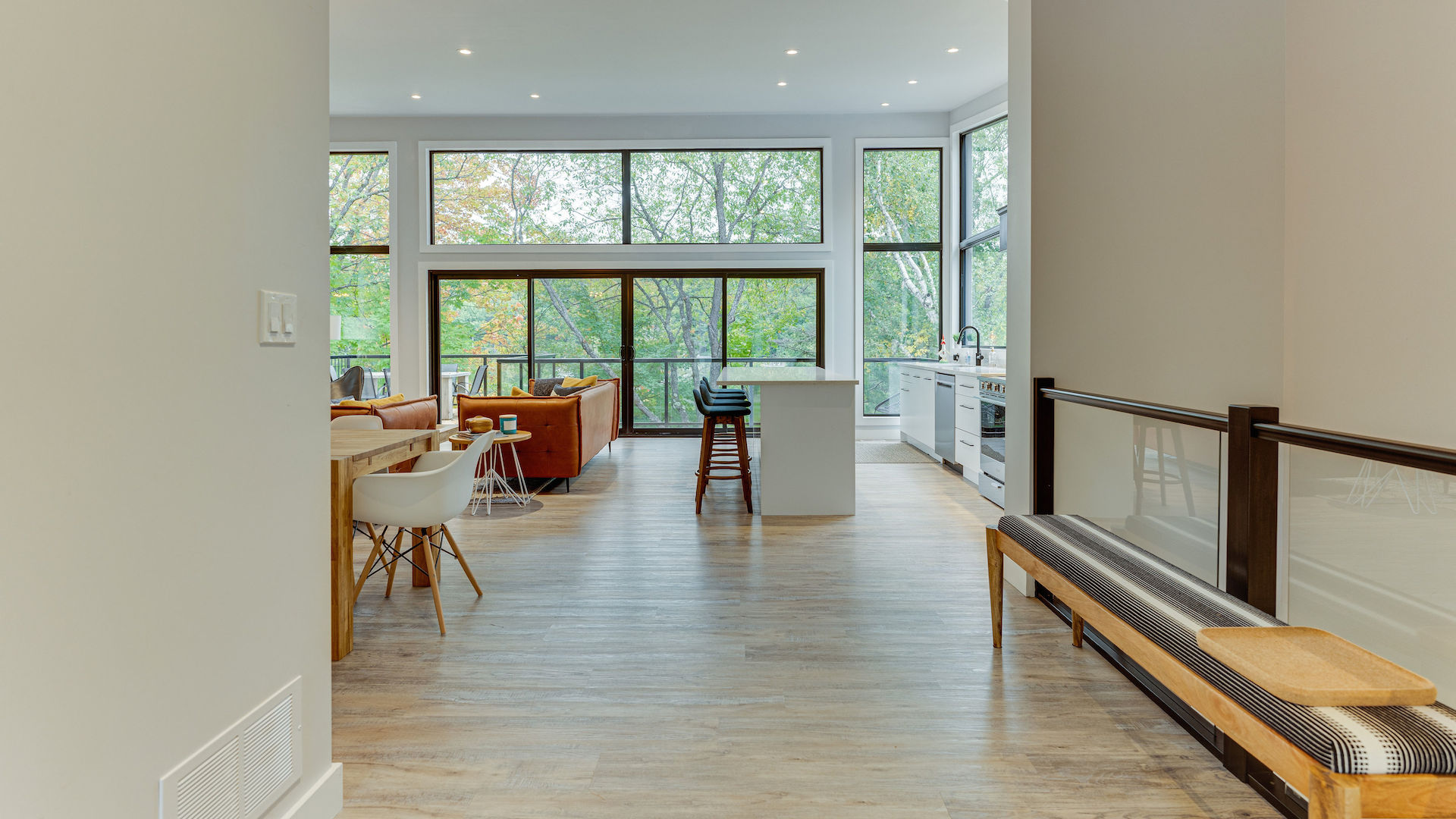 A glass wall opens up the Great Room and provides stellar views of the outdoors. Sliding doors provide access to the deck.