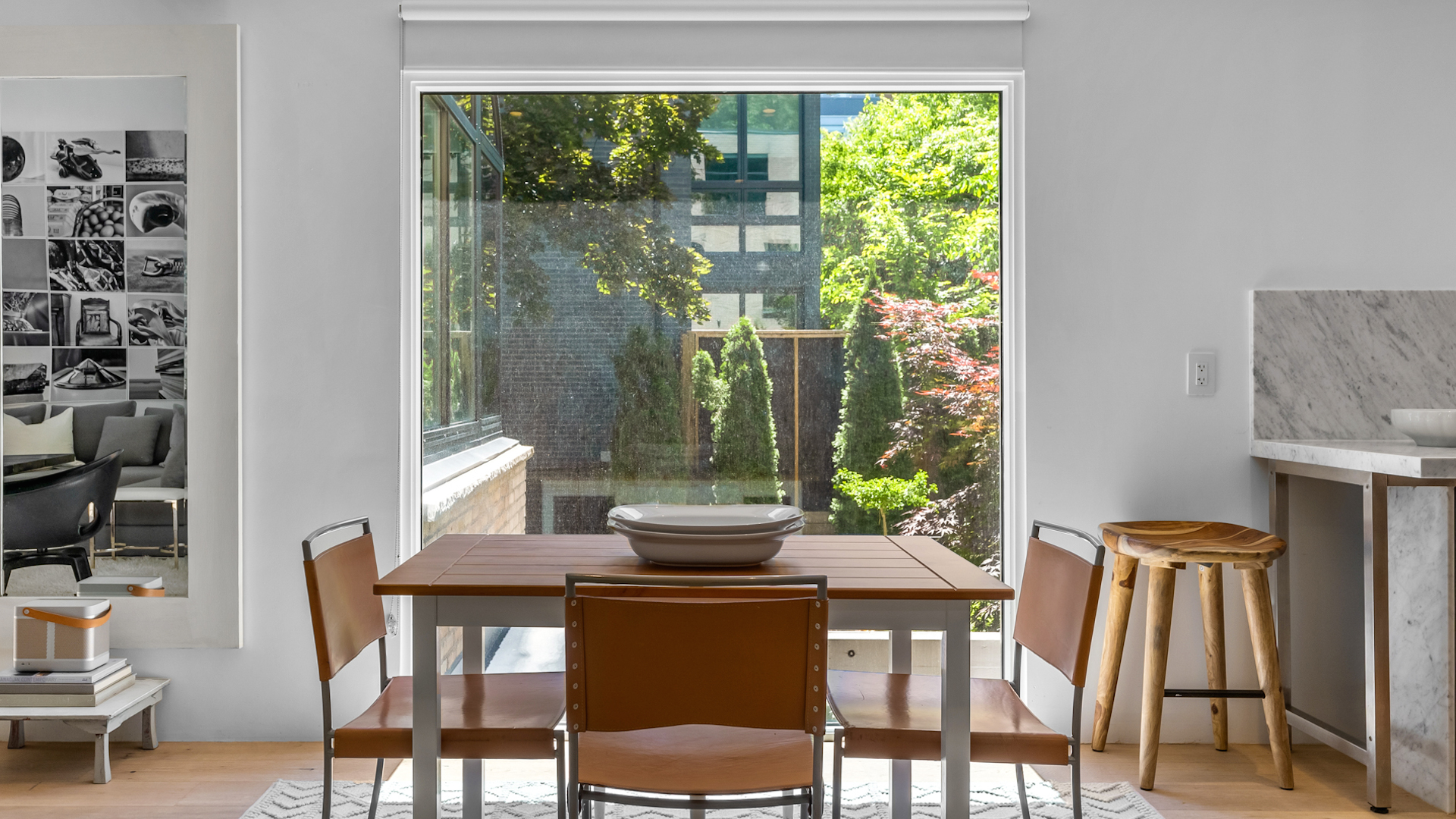 Nestled between the living-dining area and the kitchen, you’ll notice a charming spot for light meals, framed perfectly by an oversized window that looks onto the garden.