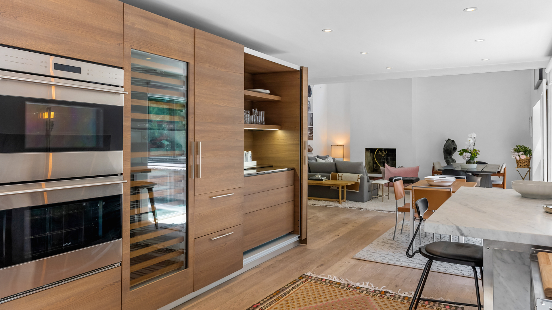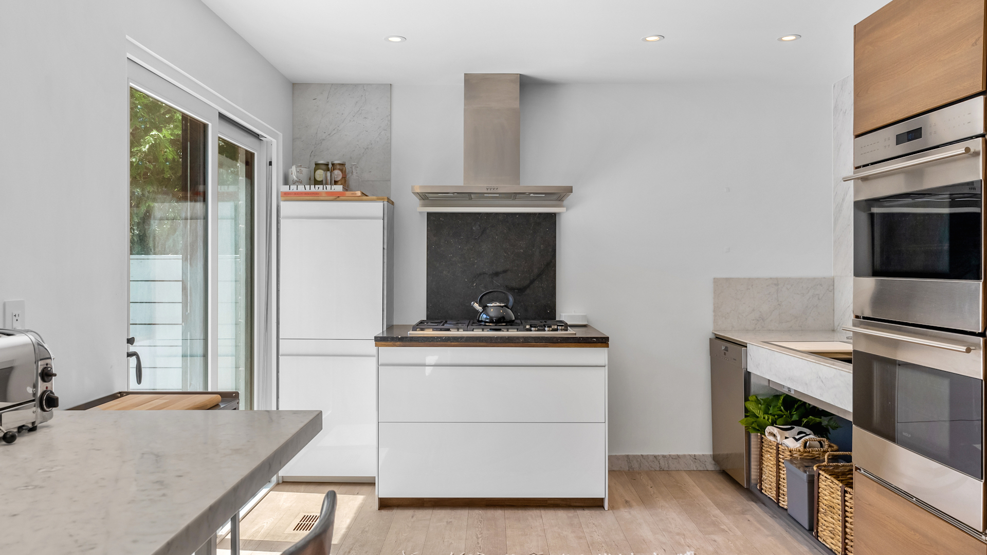 The kitchen, with white marble accents and contemporary wood veneer cabinets, features sleek built-in appliances and access to the upper patio.