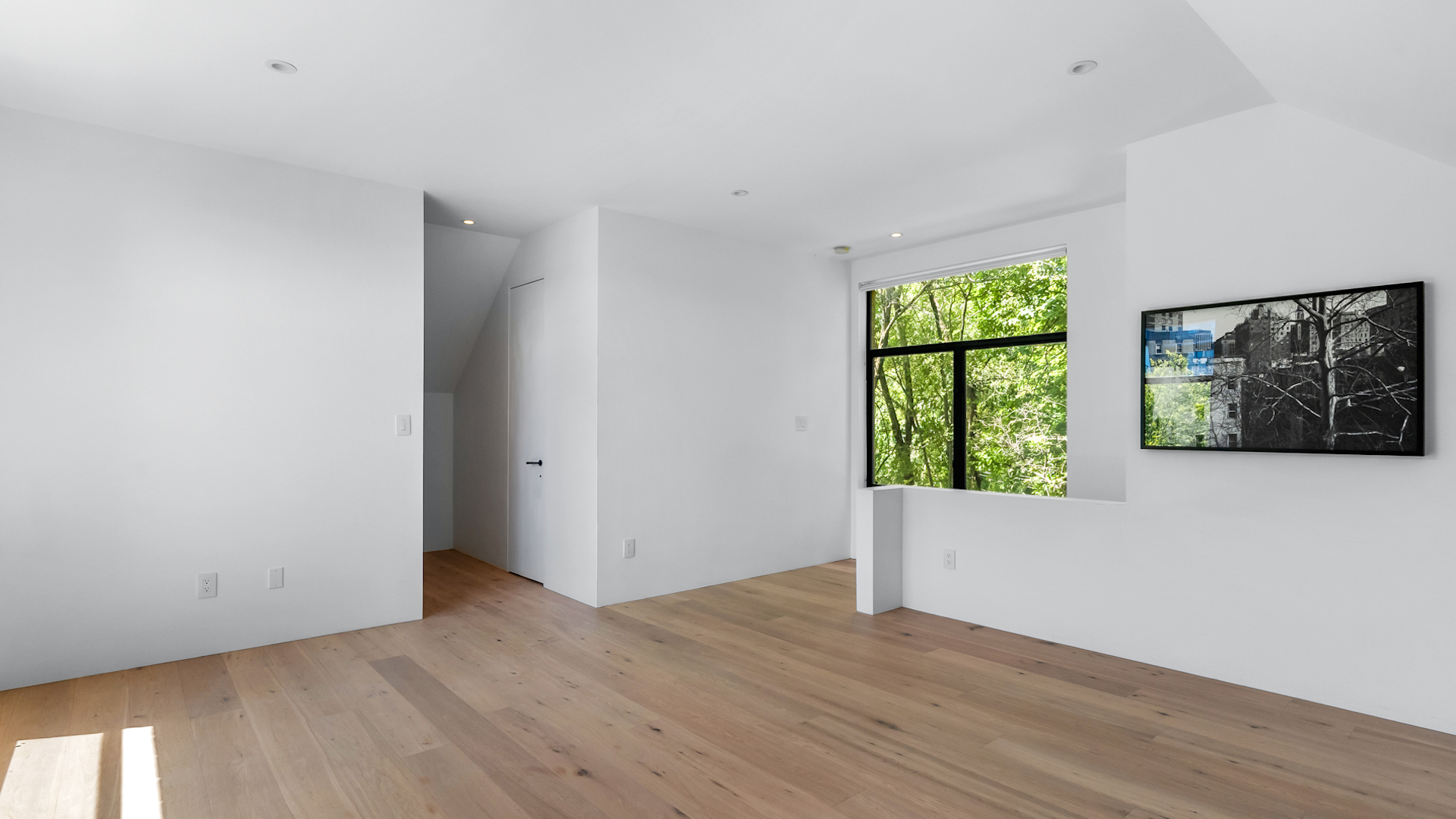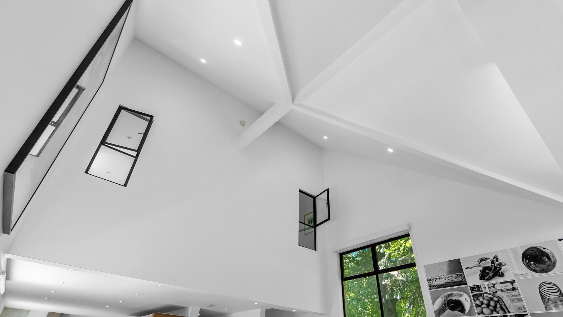 The living area with soaring ceilings, blonde wood flooring and avant-garde design is illuminated by several unique windows that bring in lots of light.