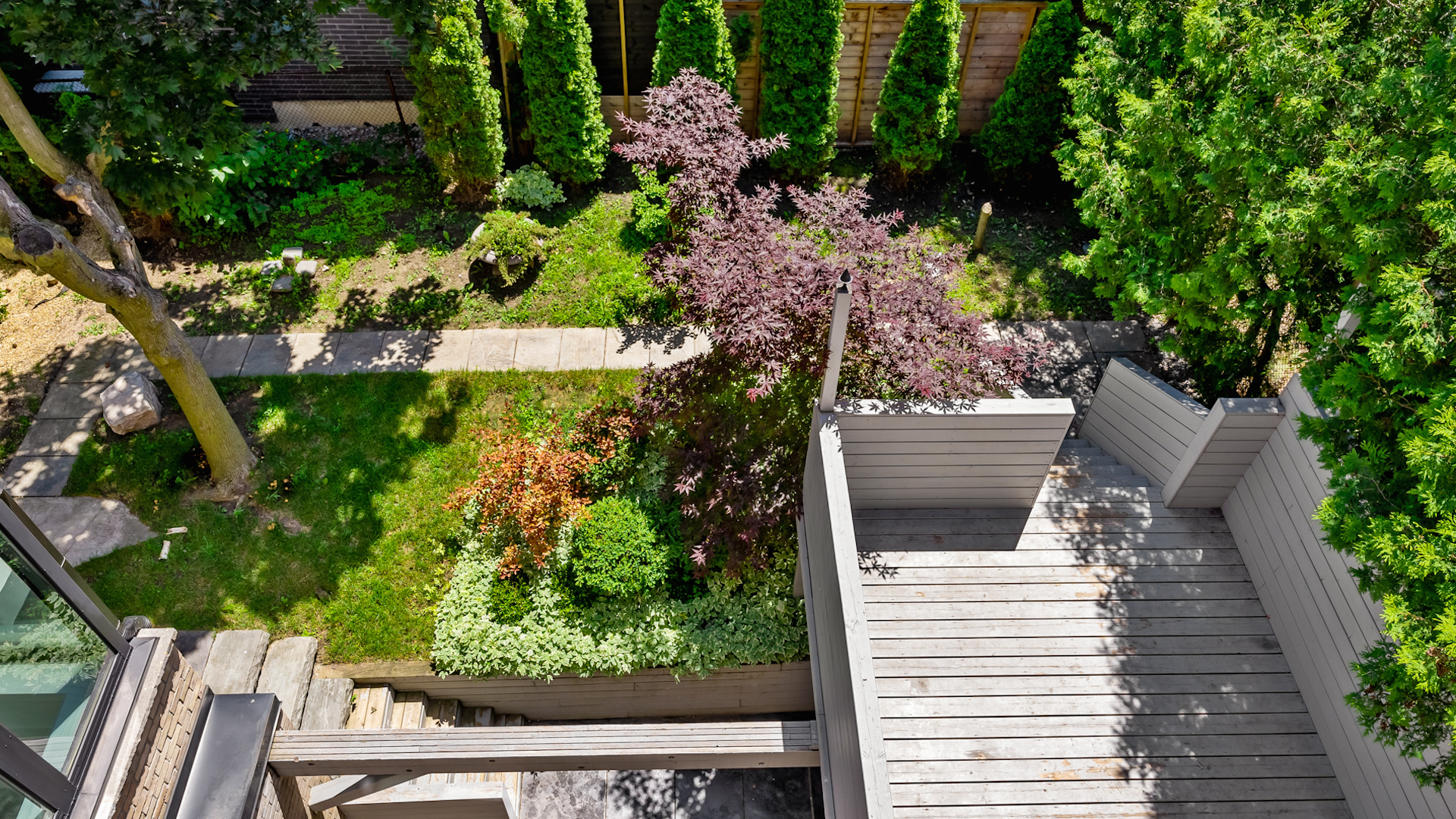 Peering down upon the garden, notice how the beautiful landscaping accentuates the property. What’s more, the backyard offers two secluded patios for outdoor time.