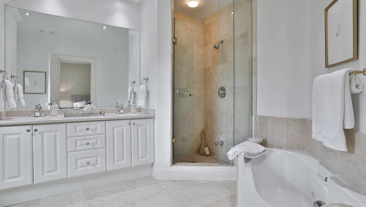 The bright five-piece ensuite bathroom features a built-in bathtub and walk-in shower.