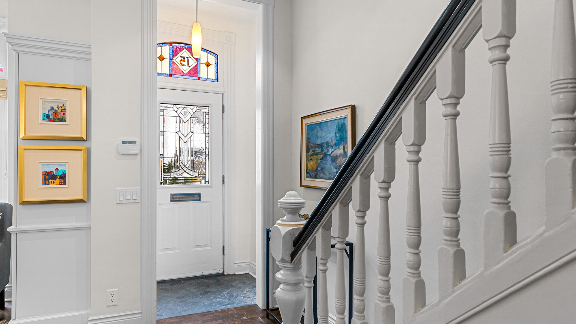 Stained glass windows stand out from the home’s white walls in the entryway.