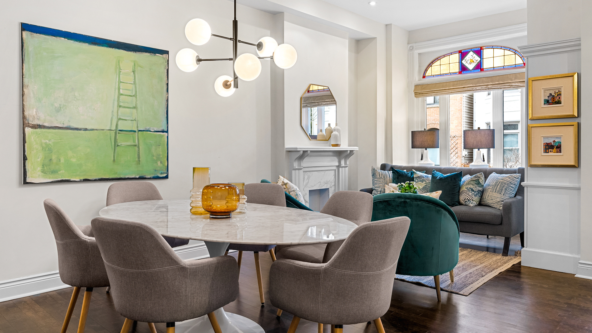 High ceilings and dark hardwood flooring span throughout the main level. There’s another stained glass window in the living room.