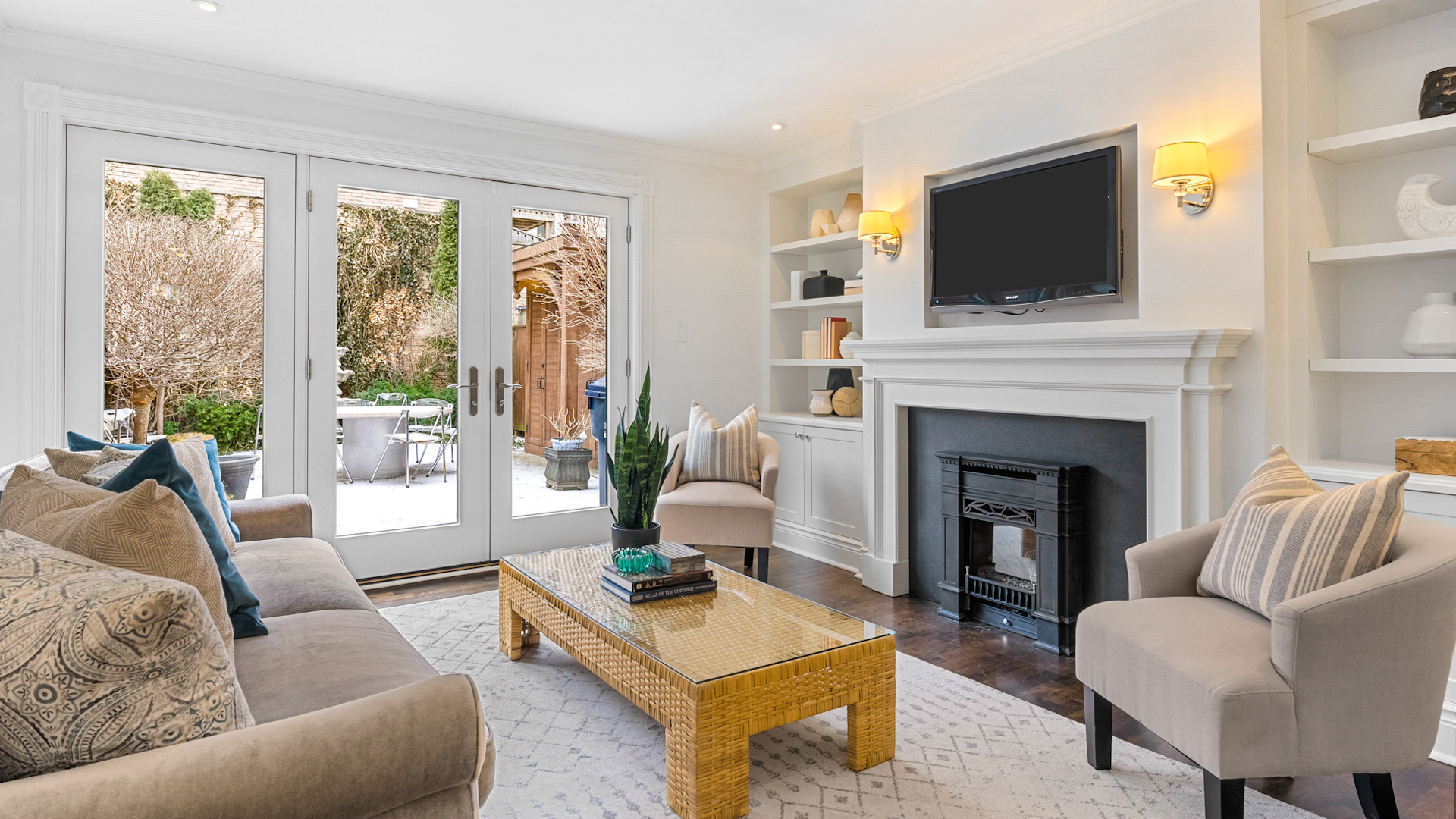 A set of double doors lead you into the bright family room. Along with direct outdoor access, it features custom built-ins and a gas fireplace.