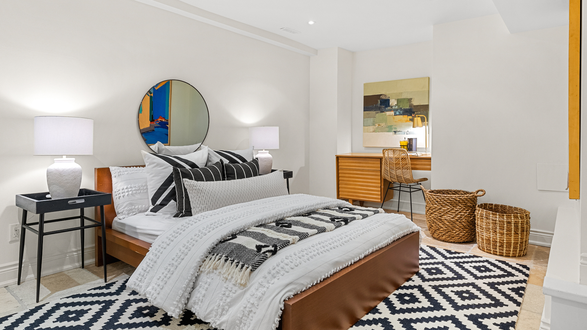 Here’s a look at the equally cosy second bedroom. It shares the ensuite bathroom with the primary bedroom.