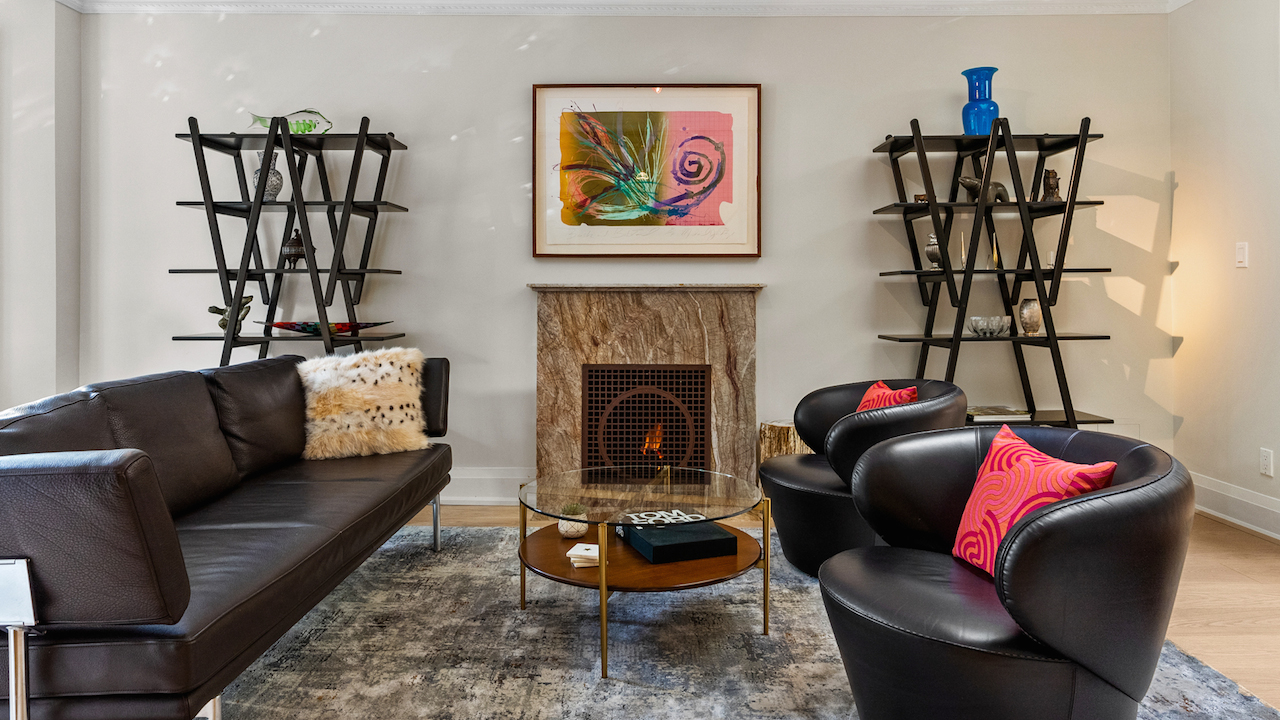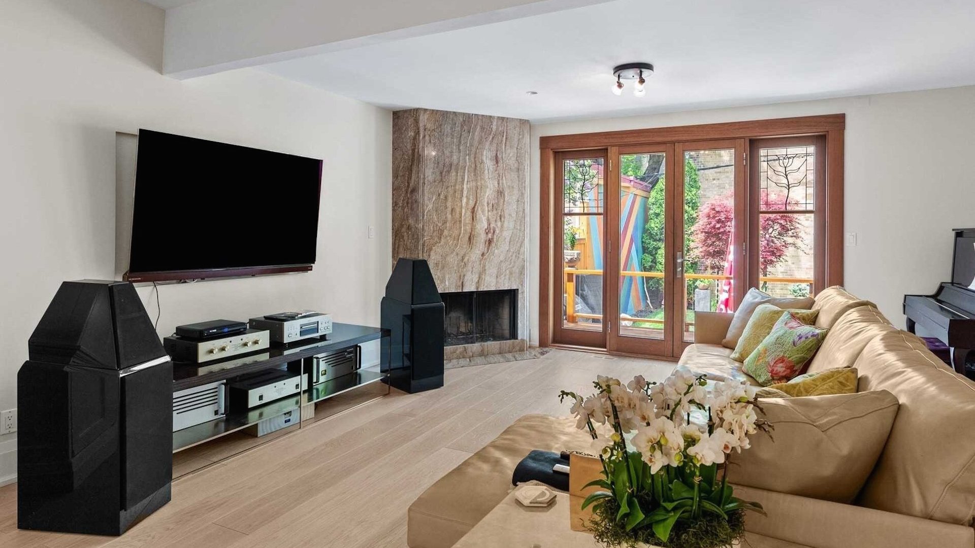At the back of the house is this fabulous family room fit with another gas fireplace. Those doors open onto an enclosed back garden. It’s a great space to entertain guests.