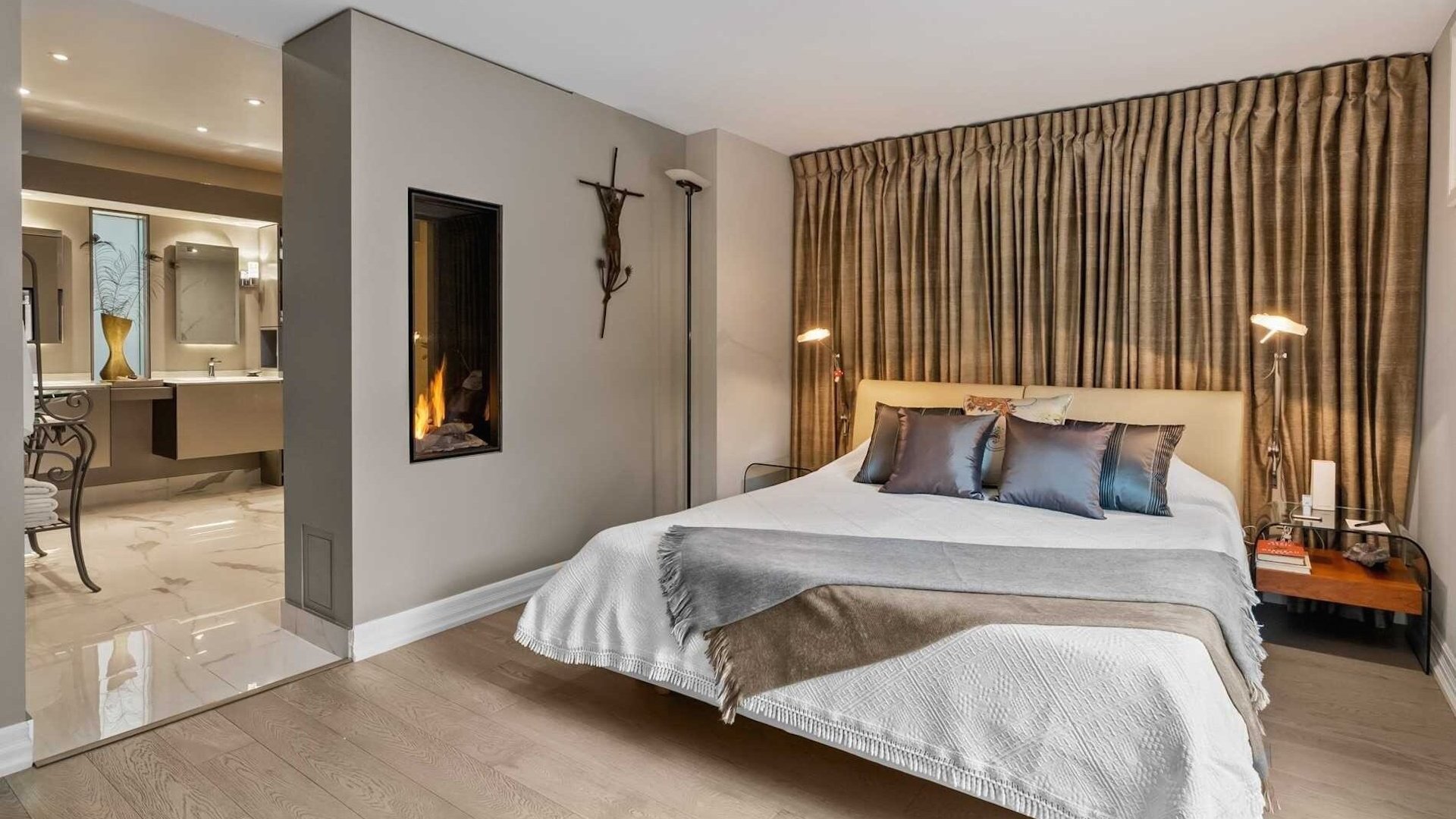 Here’s the primary bedroom. It has a private balcony that overlooks the backyard. Look at that avante garde fireplace — it’s such a luxury. Beyond it is an opulent ensuite bathroom.