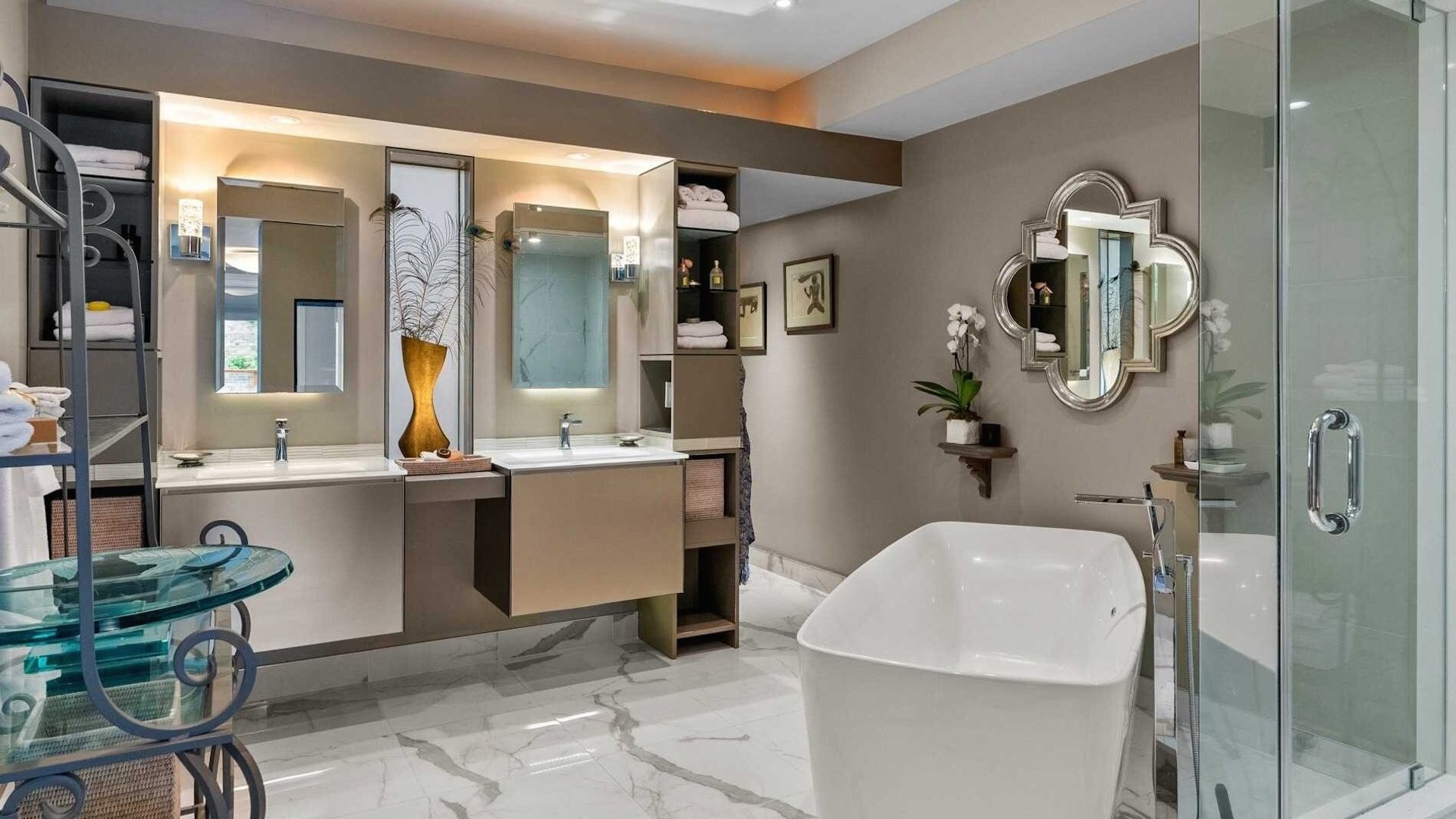 Not only does the ensuite bathroom have a marble walk-in shower, but it also has a deep soaker tub that will make you feel like you’re in a spa.
