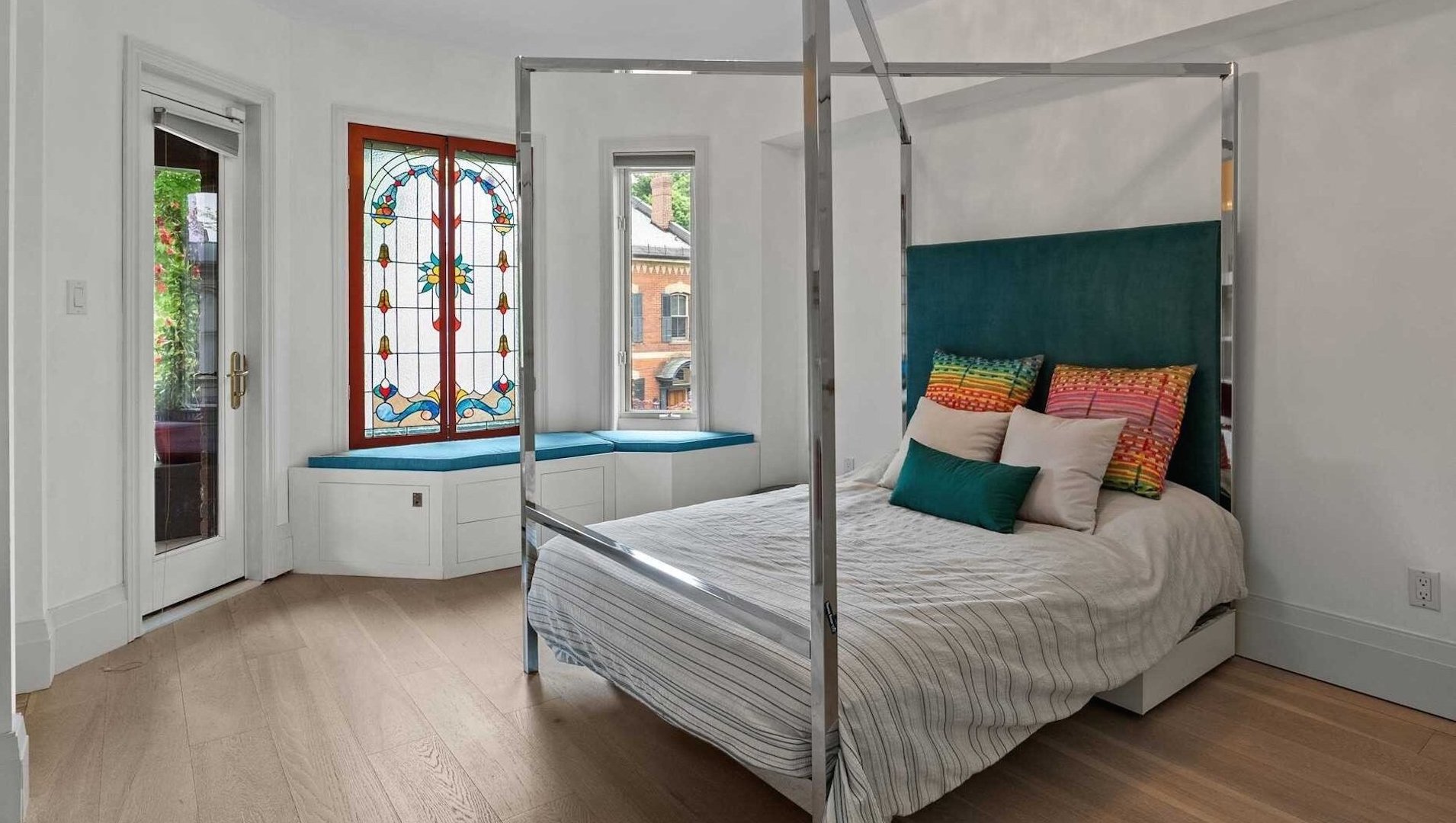 Here’s the second bedroom. Look at that charming window nook with antique stained glass — what a great place to relax and read a book. This room also has its own balcony overlooking the leafy, tree-lined street.