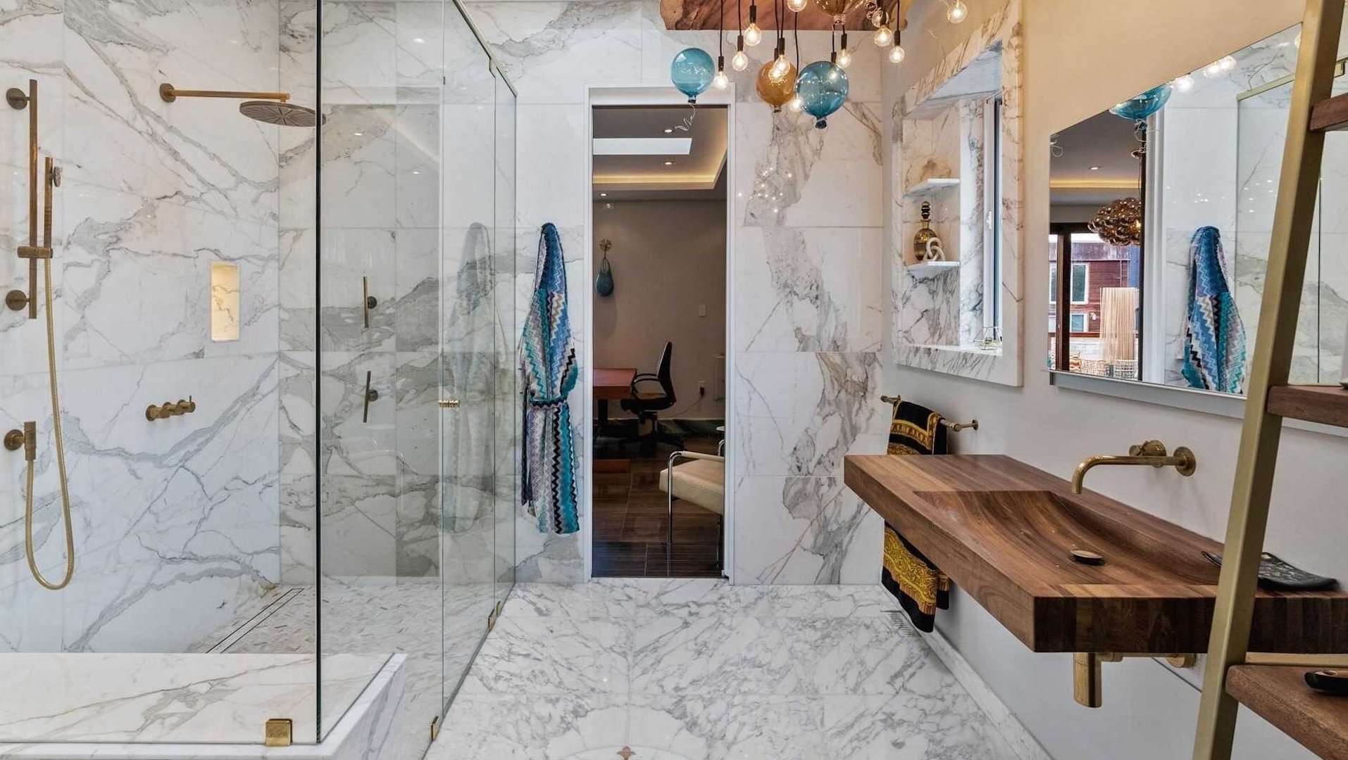 This is the loft’s breathtaking ensuite bathroom. It’s all marble, and it’s spectacular.