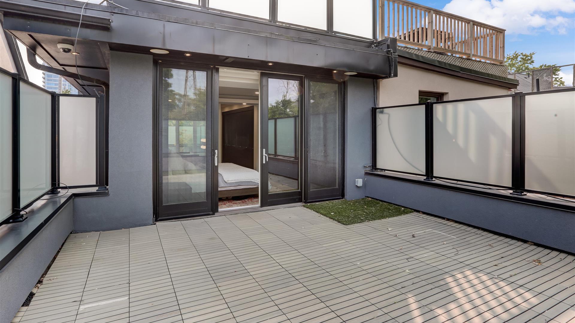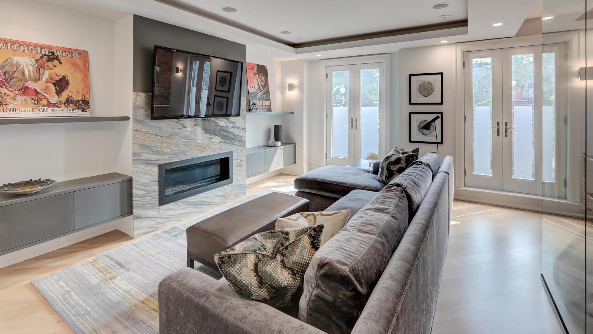 Converting one of the bedrooms into a family room was a savvy idea. The modern space includes a fireplace and two Juliet balconies.