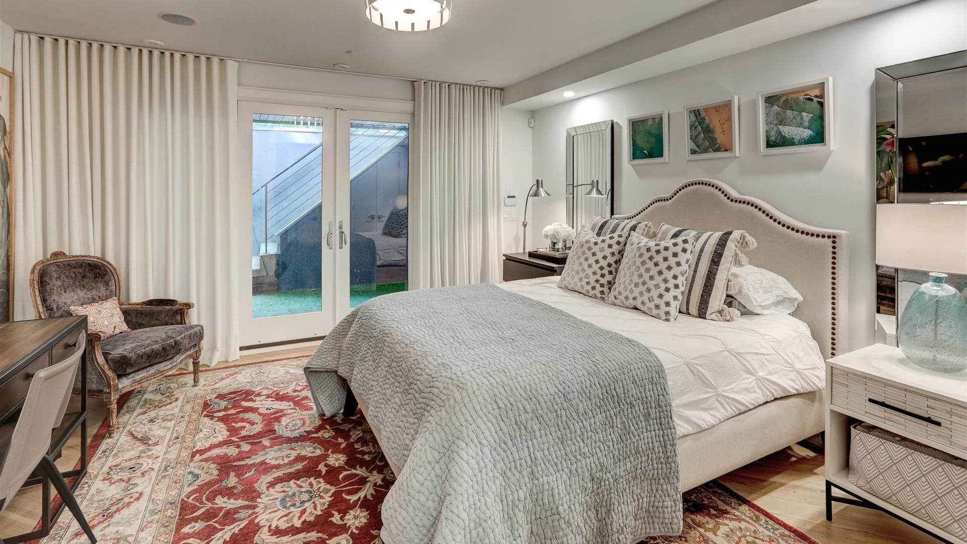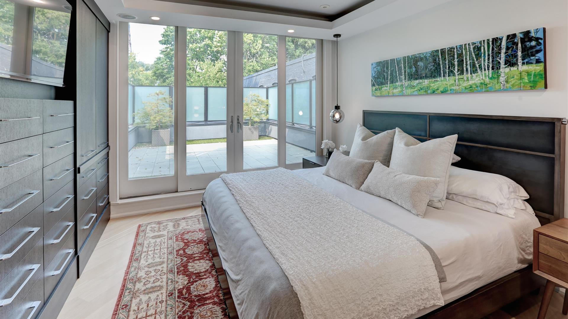 The primary bedroom is on the second level. It boasts custom closets, a vanity and access to a private balcony.