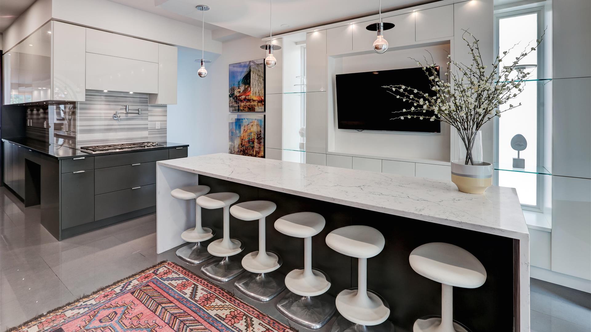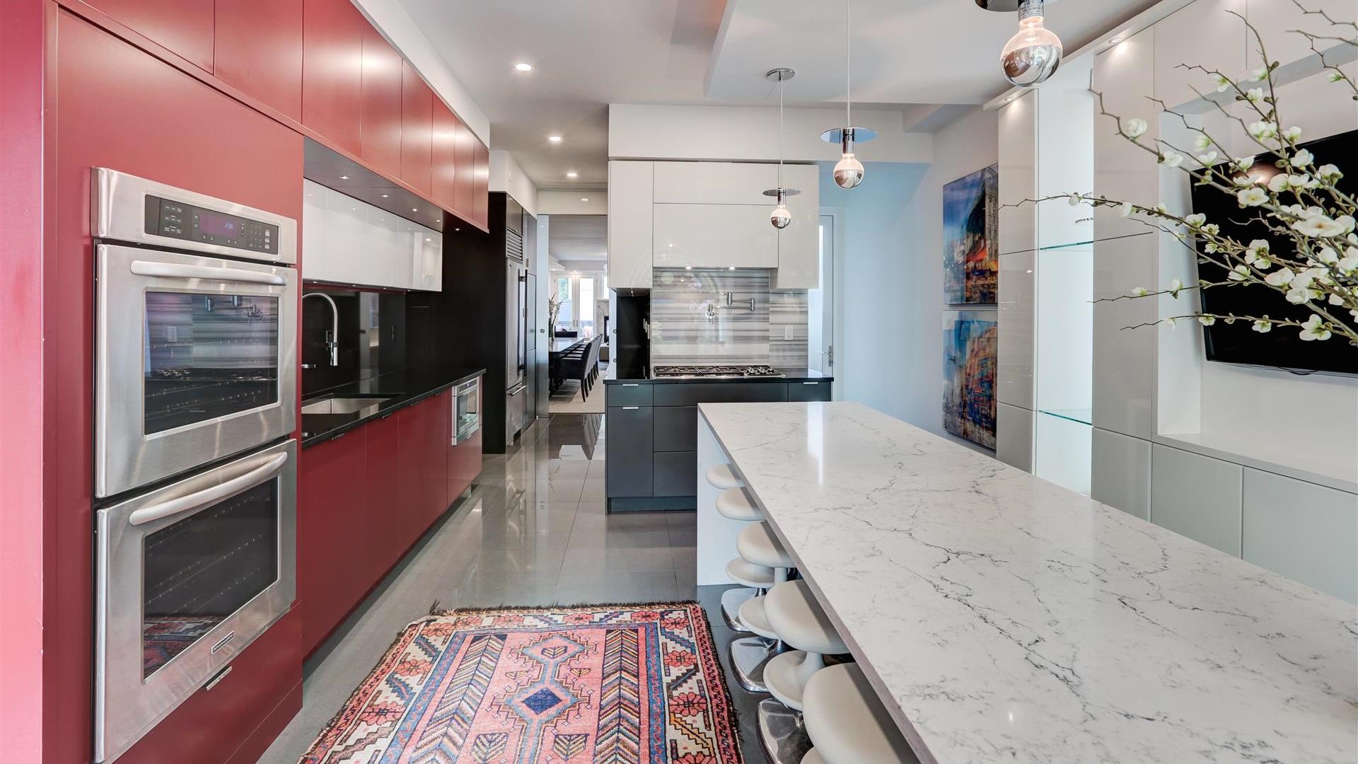 The kitchen is a showstopper thanks to the waterfall Caesarstone island, which can accommodate six barstools. It’s also designed with sleek red and white cabinetry.