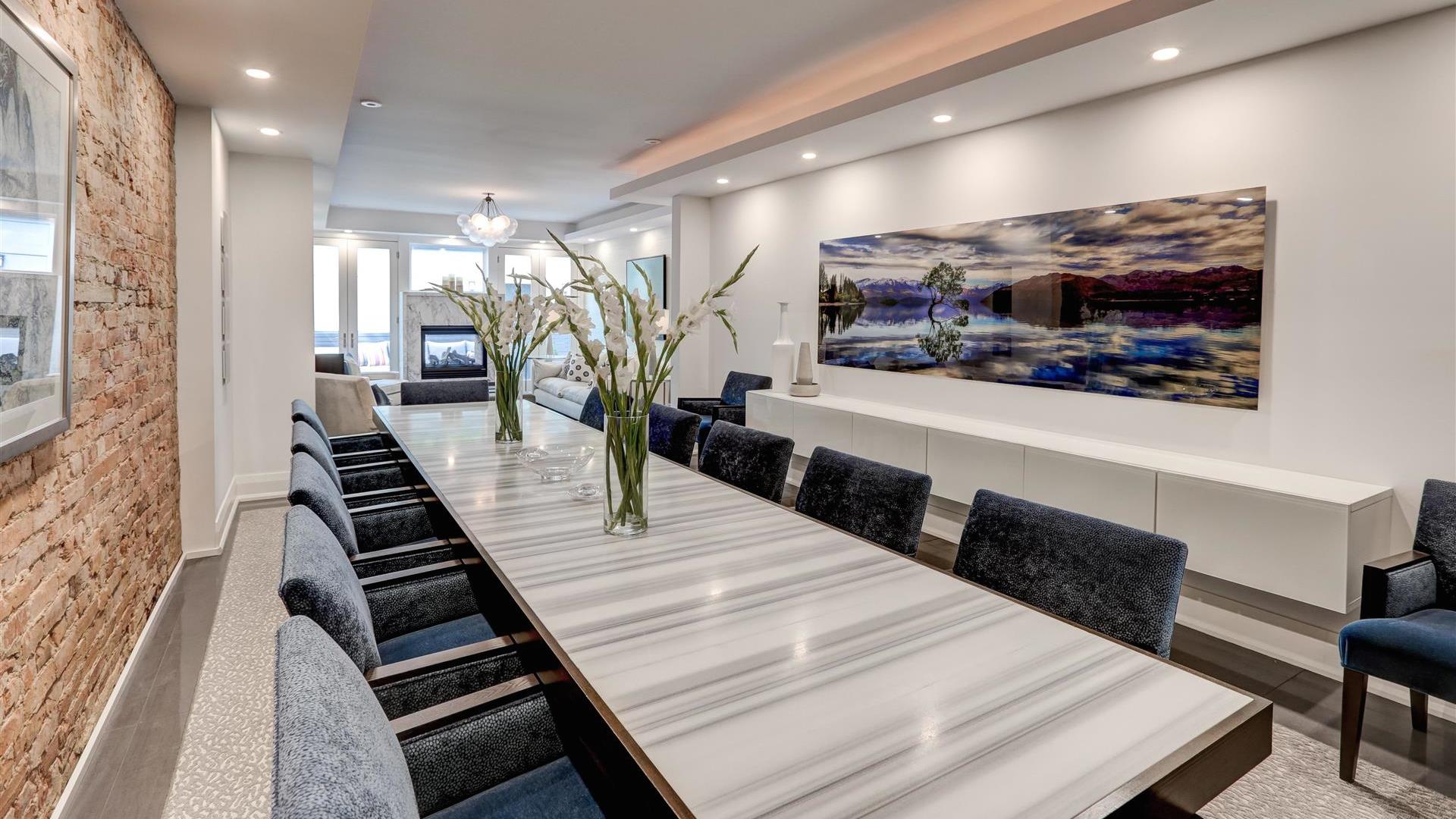 You can fit a 12-person table in the dining room, which features an exposed brick wall.