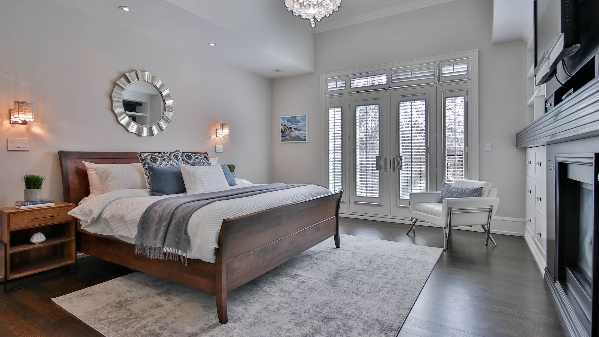Much of the floorplan upstairs is dedicated to the primary bedroom, which comes with a Juliet balcony and fireplace.