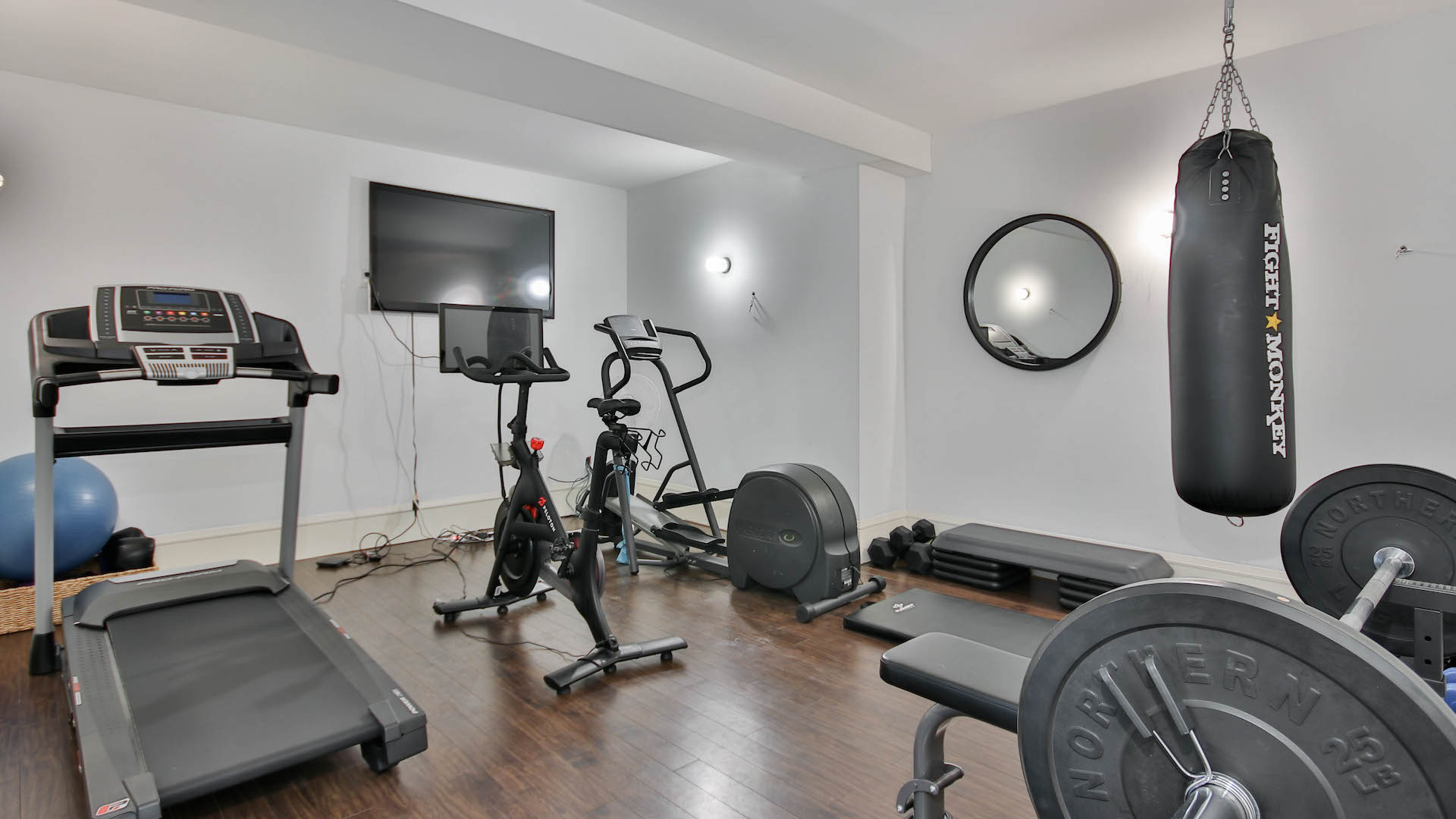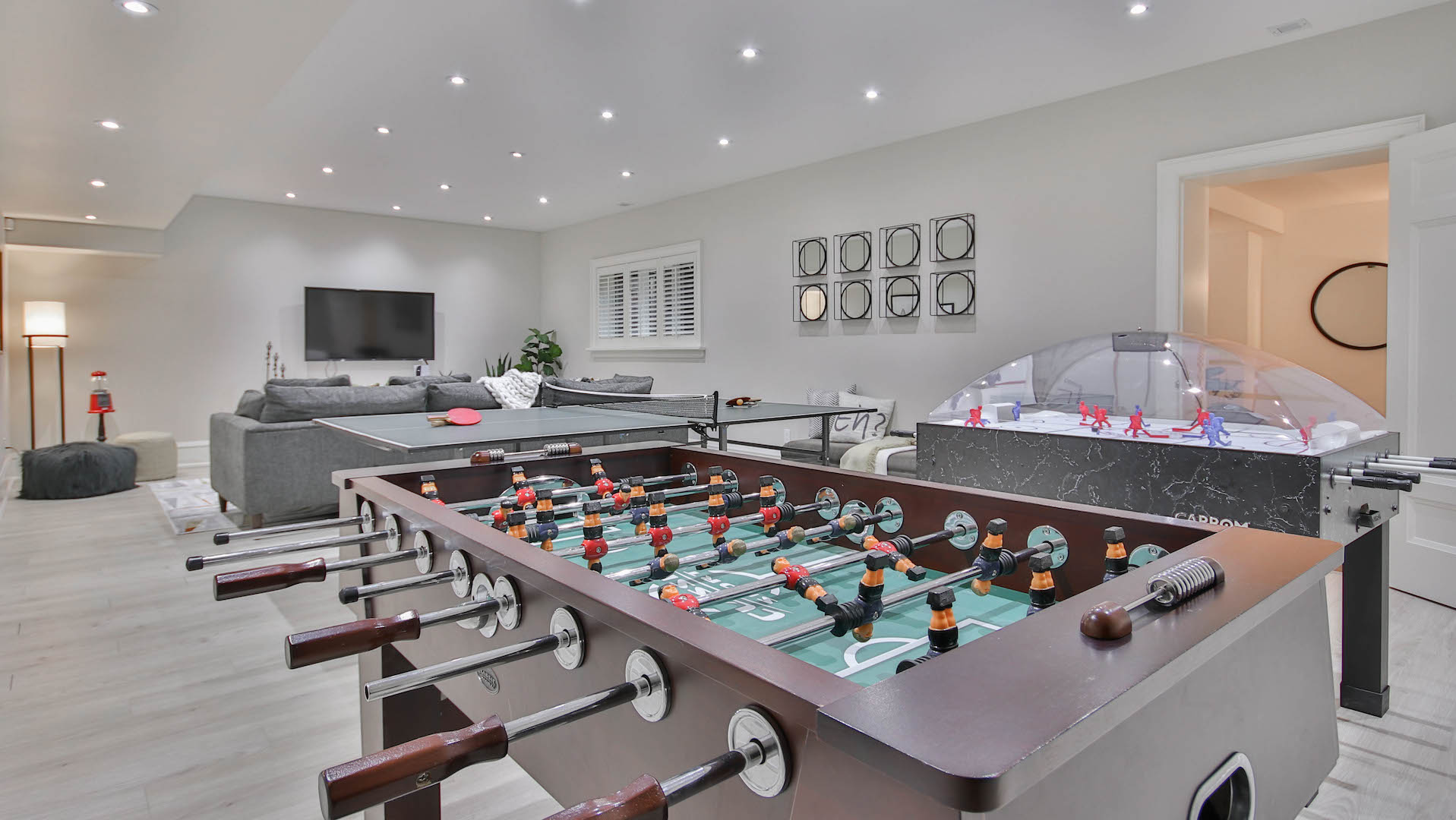 Pot lights brighten up the lower level recreation room. It has enough space to accommodate a movie theatre, home gym, and guest bedrooms.
