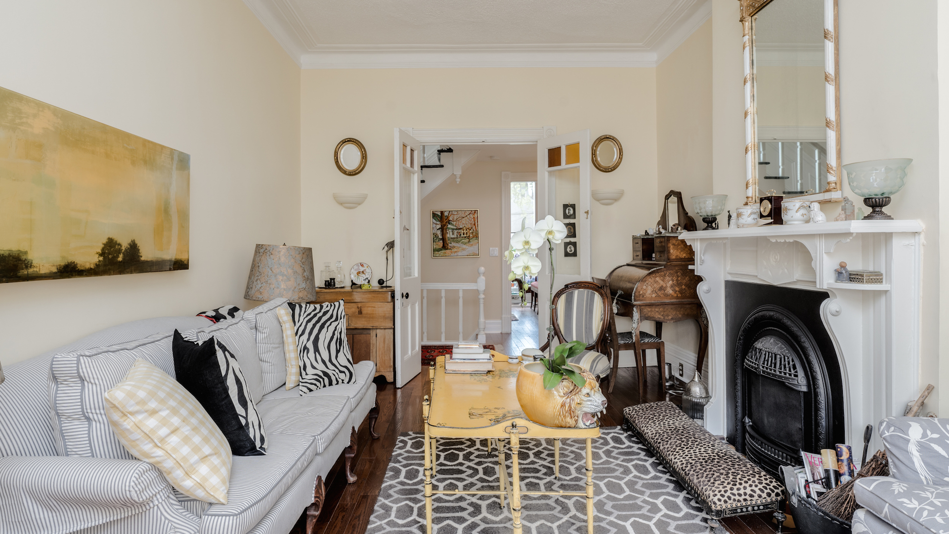 Notice the ornate gas fireplace? It adds such style and ambiance. Beyond that are a pair of beautiful antique parlour doors.