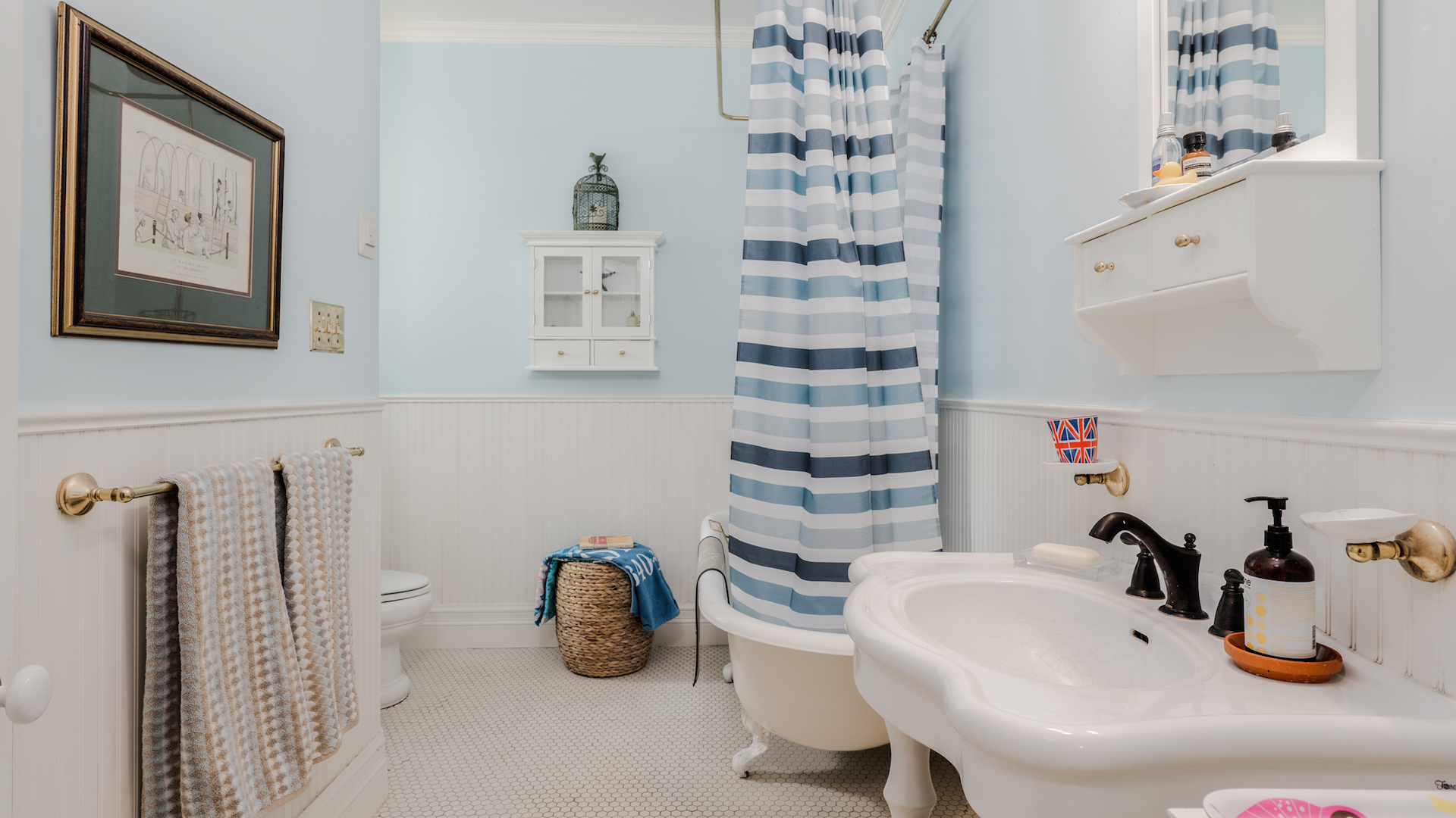 The washroom boasts a beautiful porcelain sink and a clawfoot tub ideal for bubble baths.
