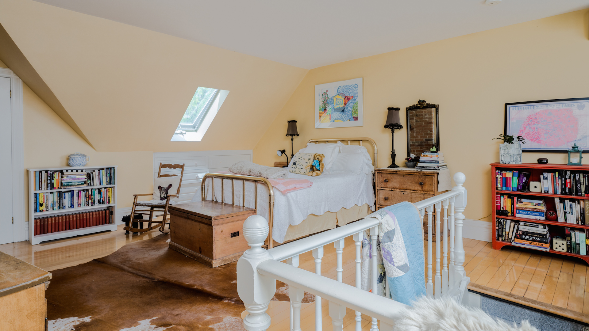On the top floor, you’ll find this whimsical loft with a skylight. Imagine gazing up at the moon from your bed. This room also has access to a large patio retreat.