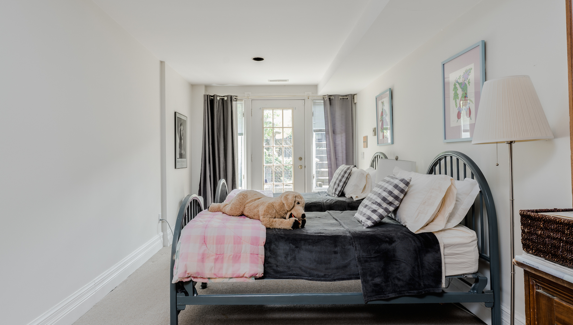 Heading downstairs, you’ll find that the basement has a surprising amount of natural light — thanks to a side-lit glass door that exits directly onto the backyard’s lower terrace.