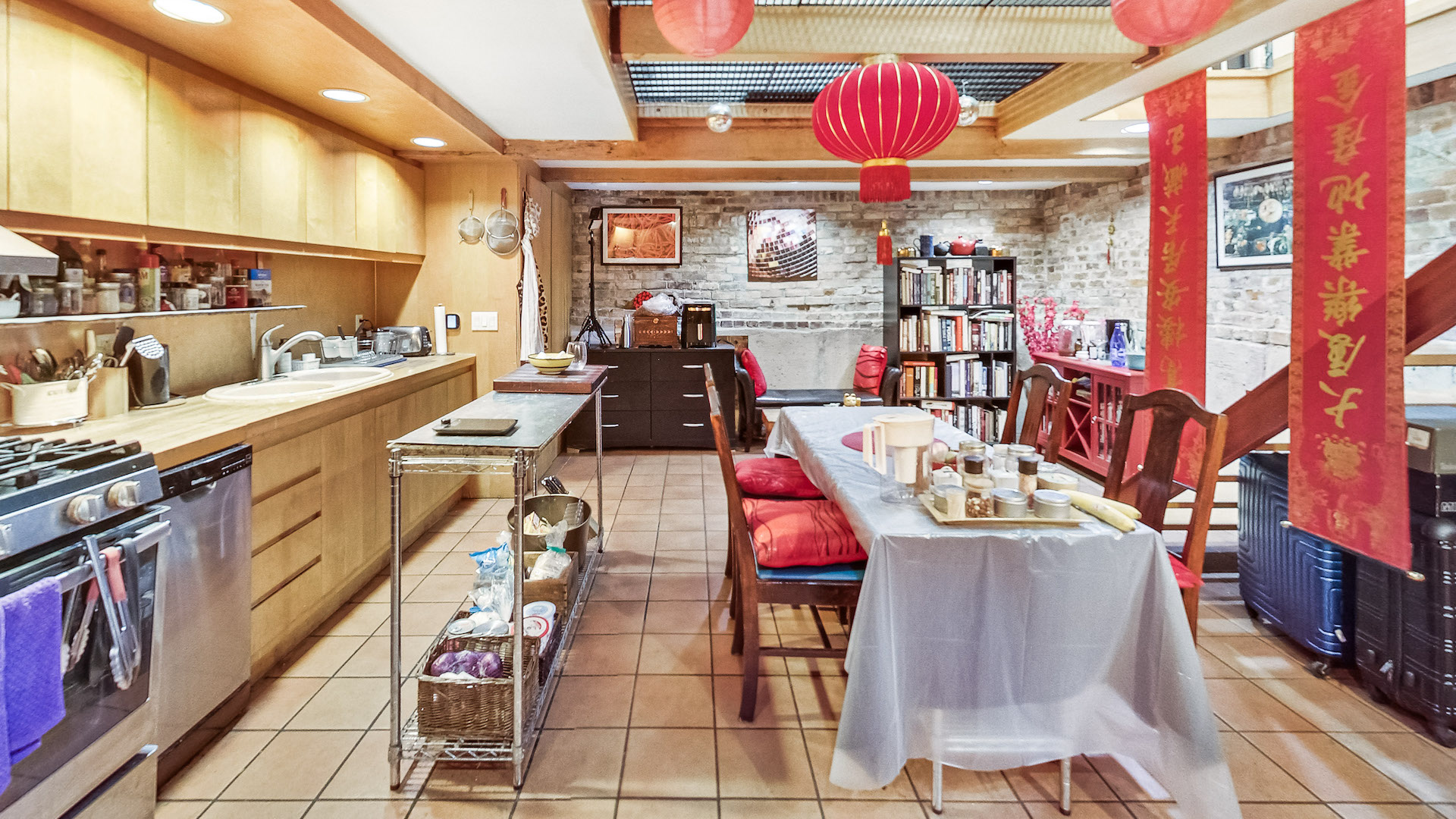 The ground-floor apartment includes a spacious lower-level kitchen accentuated by whitewashed exposed brick. The industrial-chic glass panel showers the room with light.
