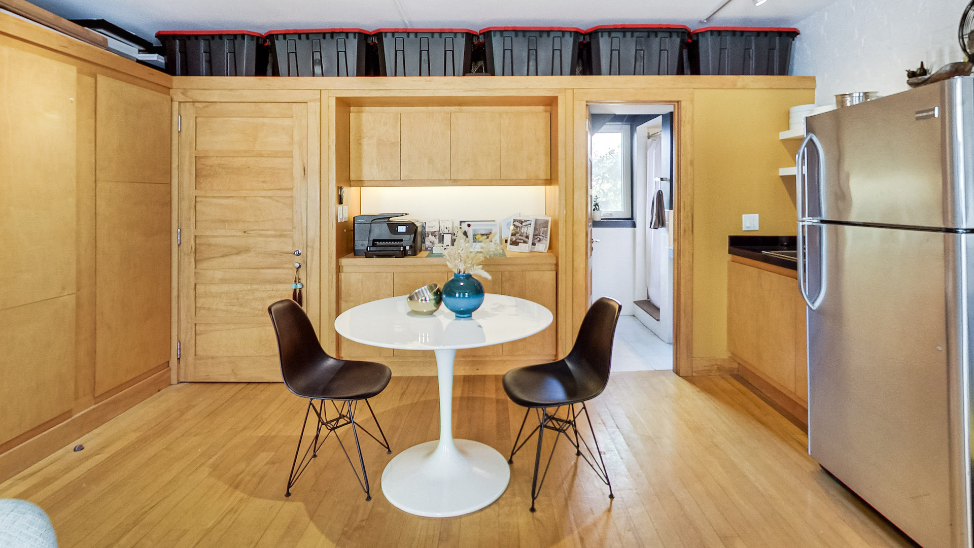 Currently used as an office, the second floor provides an ideal setup for a work-from-home professional or entrepreneur. This comfortable living space offers a three-piece bathroom and a kitchen with plenty of custom millwork and storage.
