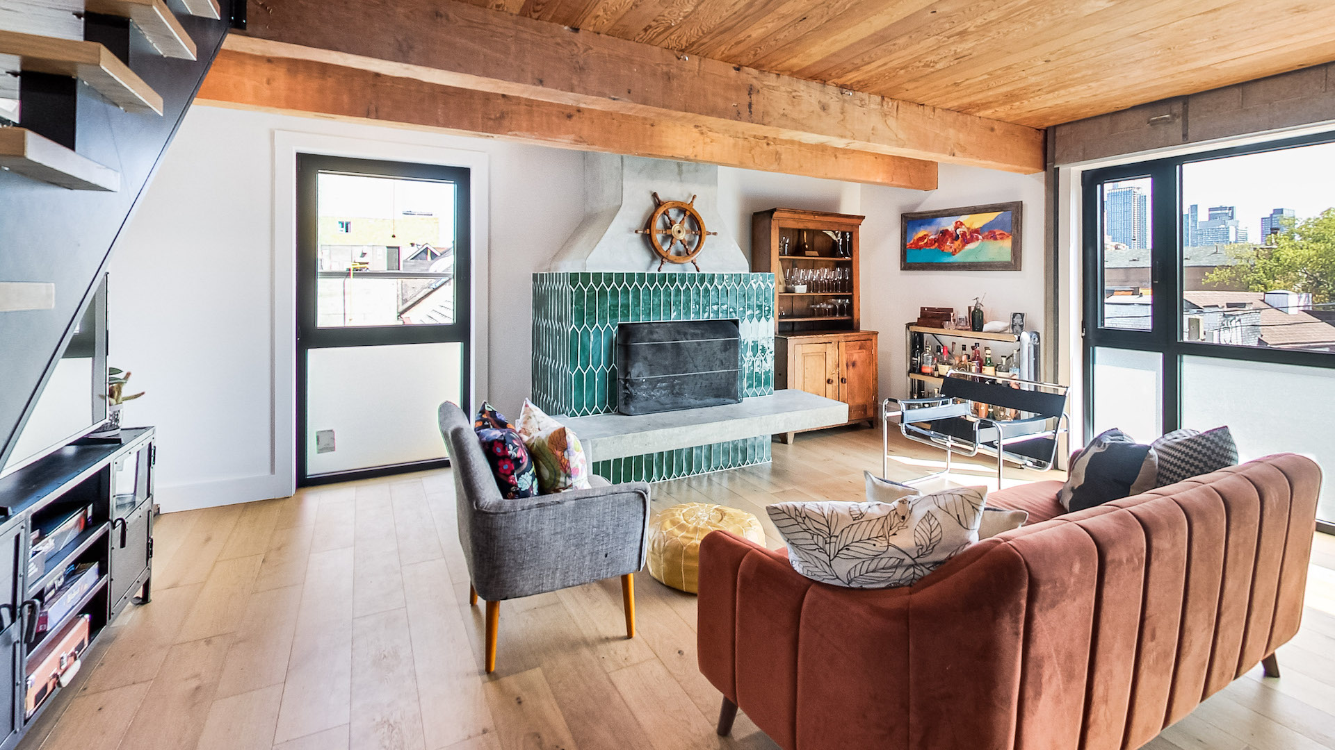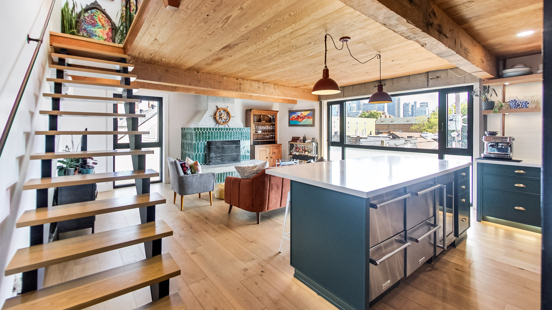 Hard loft beams, natural wood elements and an emerald green wood-burning fireplace create a cozy ambiance.