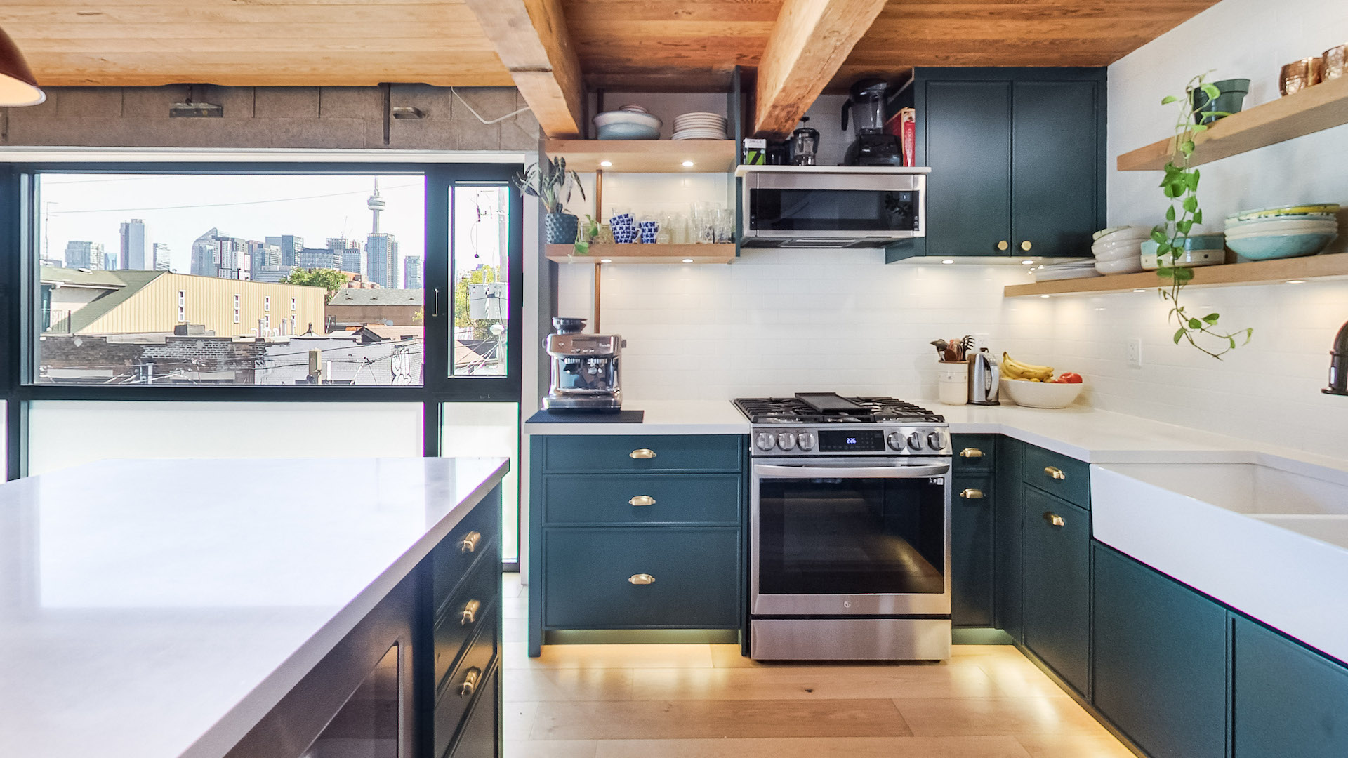 The kitchen features a large picture window, distinctive teal cabinets and generous white stone countertops.